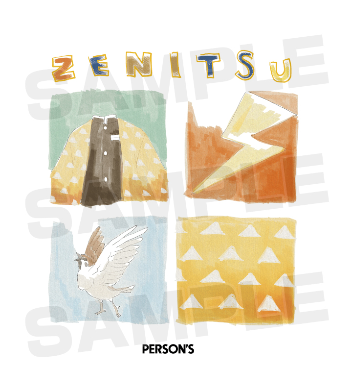 我妻善逸の隊服と羽織、雷、チュン太郎、羽織の柄をPERSON'Sらしさのあるタッチで表現し、フロント部分にレイアウトしました。