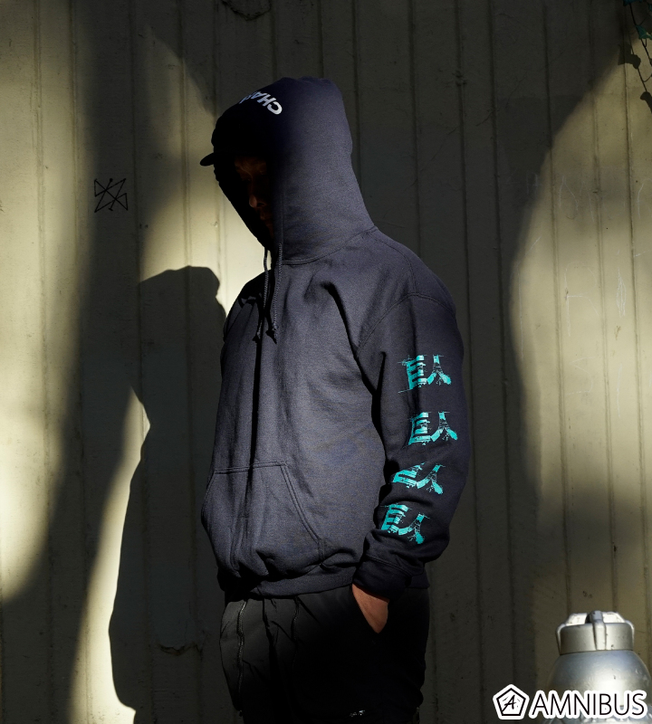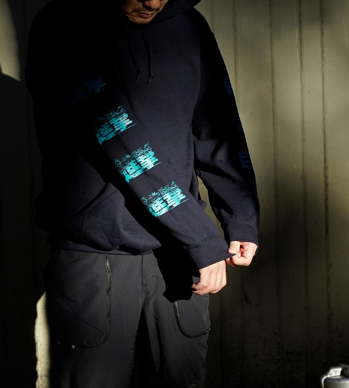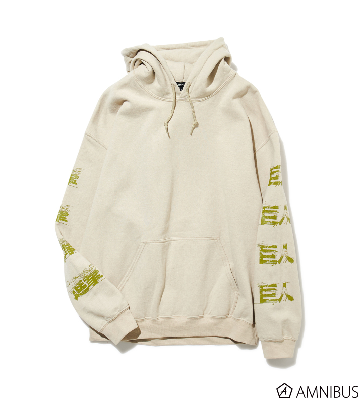 それぞれの袖に“進撃”と“巨人”を落とし込んだ、HOODIE SWEATS。フード口にはオリジナルロゴを配置した象徴的な一枚。