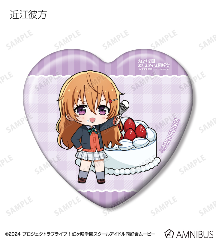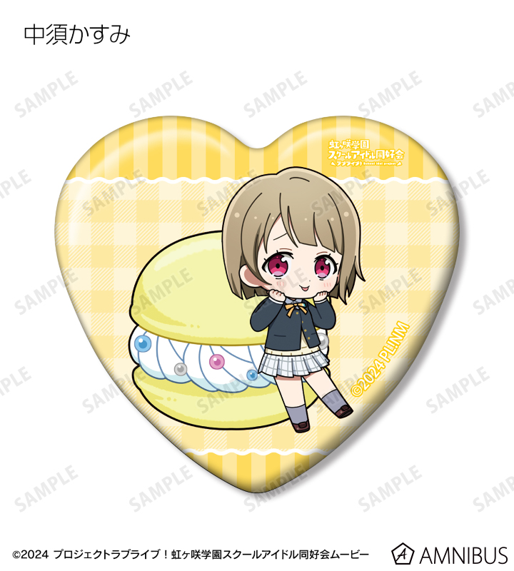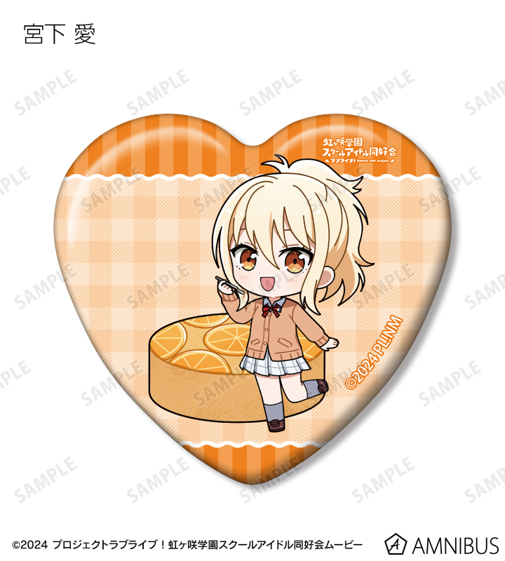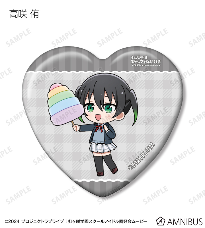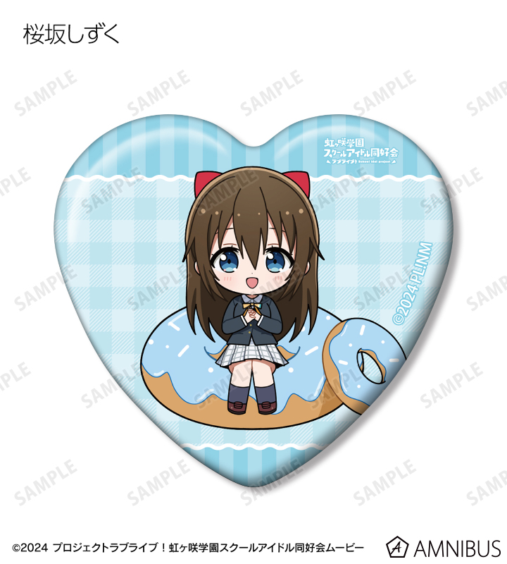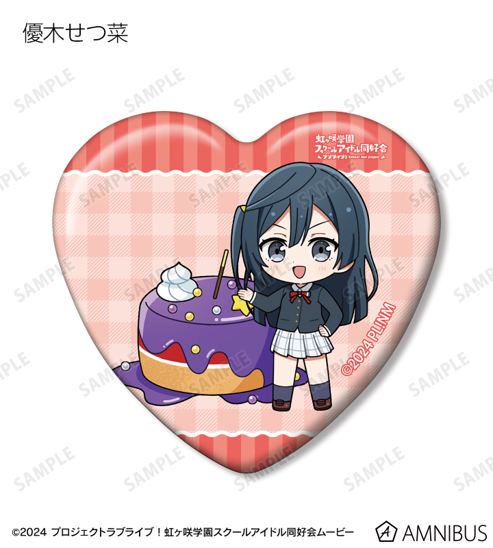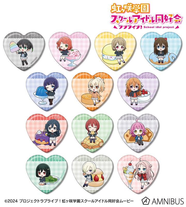 高咲 侑、上原歩夢、中須かすみ、桜坂しずく、朝香果林、宮下 愛、近江彼方、優木せつ菜、エマ・ヴェルデ、天王寺璃奈、三船栞子、ミア・テイラー、鐘 嵐珠のちびキャライラストをメインにデザインし、ハート型の缶バッジに仕上げました。