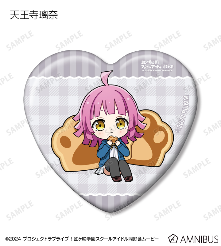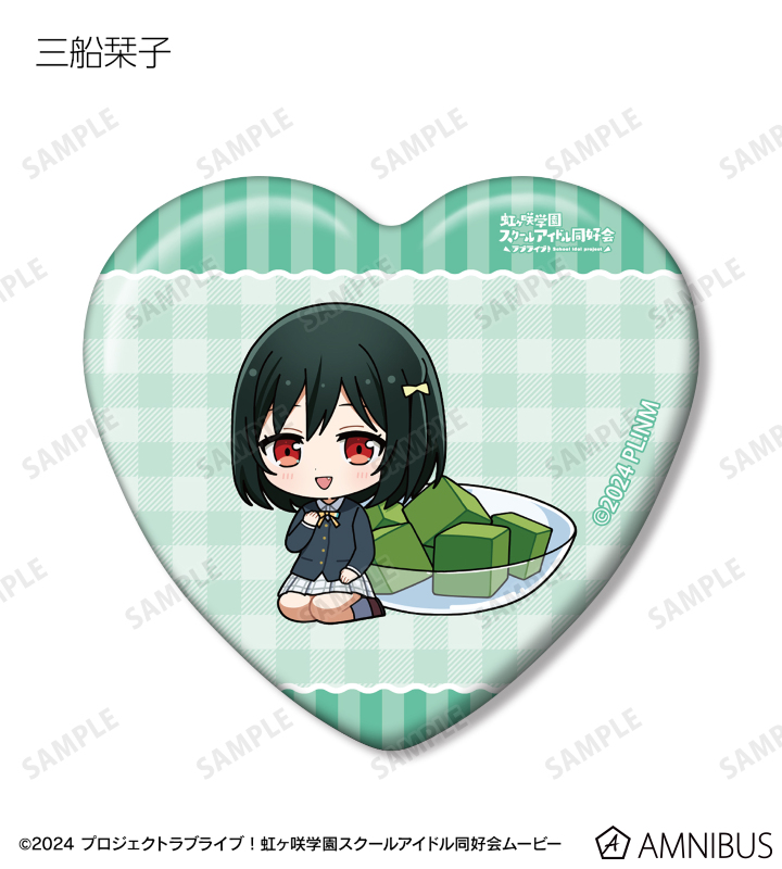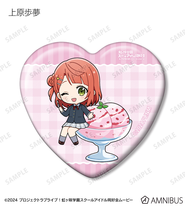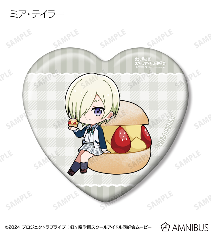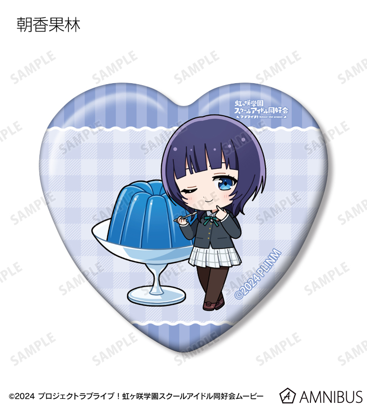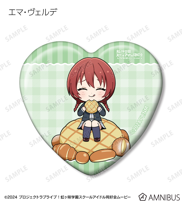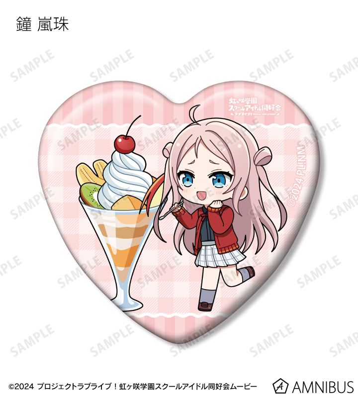 高咲 侑、上原歩夢、中須かすみ、桜坂しずく、朝香果林、宮下 愛、近江彼方、優木せつ菜、エマ・ヴェルデ、天王寺璃奈、三船栞子、ミア・テイラー、鐘 嵐珠のちびキャライラストをメインにデザインし、ハート型の缶バッジに仕上げました。