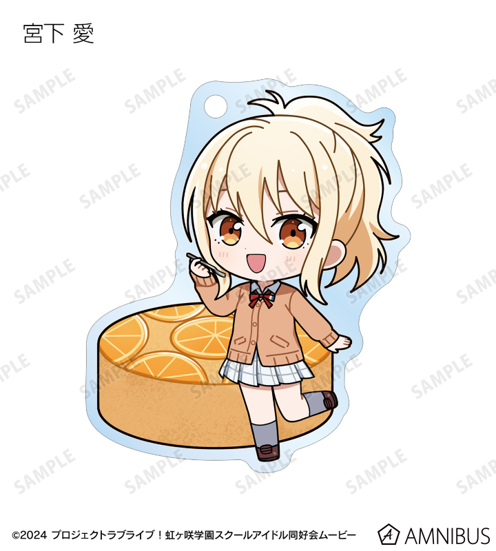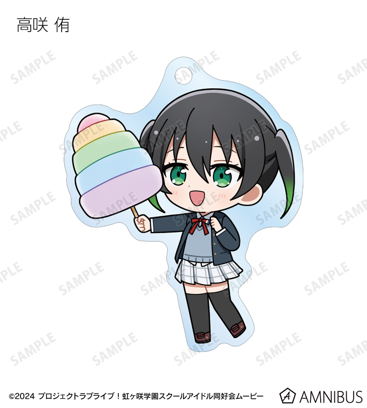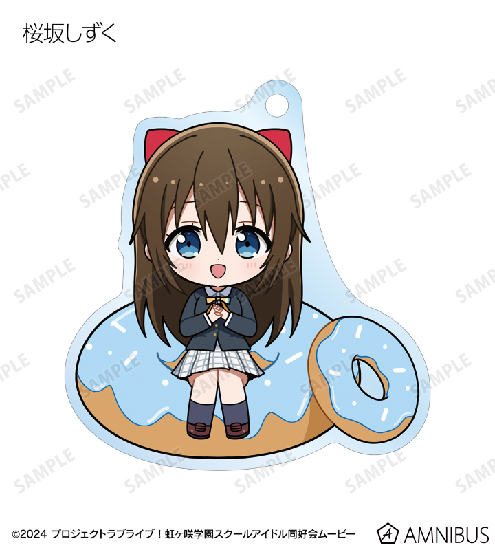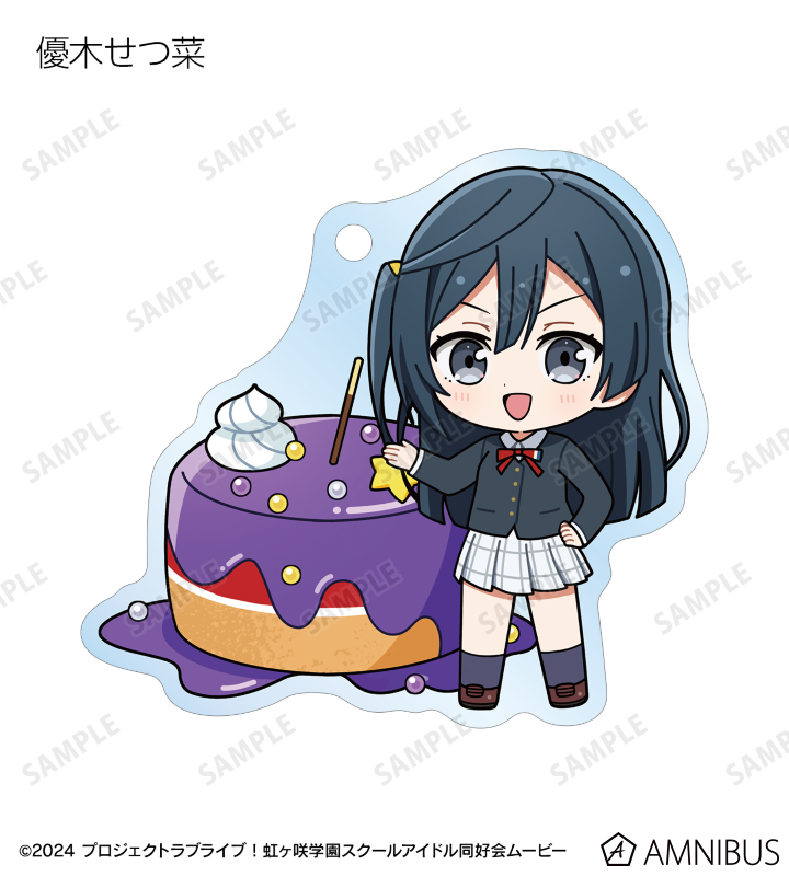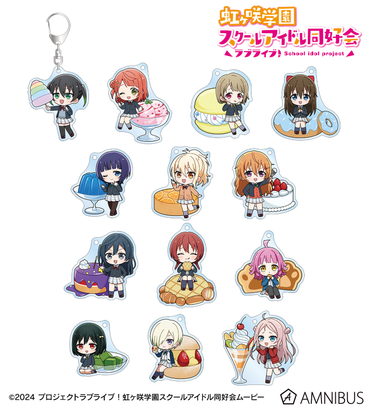 高咲 侑、上原歩夢、中須かすみ、桜坂しずく、朝香果林、宮下 愛、近江彼方、優木せつ菜、エマ・ヴェルデ、天王寺璃奈、三船栞子、ミア・テイラー、鐘 嵐珠のちびキャライラストをメインにデザインし、アクリルキーホルダーに仕上げました。