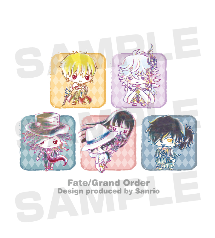 サンリオデザインプロデュースのギルガメッシュ(アーチャー)、マーリン、巌窟王 エドモン・ダンテス、坂本龍馬、岡田以蔵を新たなタッチで魅力的に表現しました。