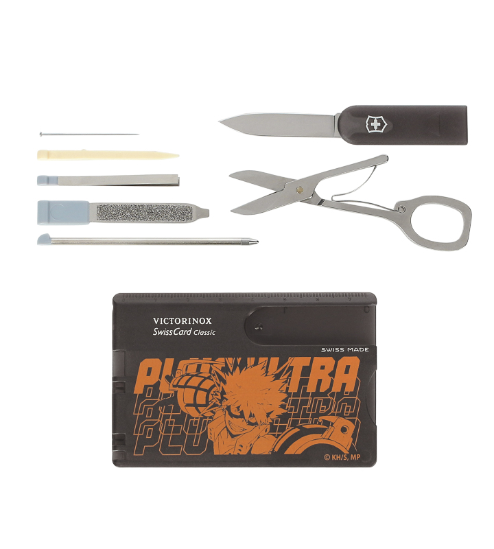 TVアニメ『僕のヒーローアカデミア』から「ビクトリノックス」のアイテム「ビクトリノックス 爆豪勝己 スイスカード」の登場です。 ビクトリノックスは、マルチツール、キッチンナイフ、ウォッチ、トラベルギア、フレグランスといった、日常のさまざまなシーンで役立つユニークかつ高品質の製品を世界中で生産販売しているブランドです。 爆豪勝己と「PLUS ULTRA」の文字を合わせてレイアウトし、キャラクターからイメージしたカラーリングで仕上げました。 「スイスカード」は、日常的に使うことができる10の機能をバランスよく搭載しています。