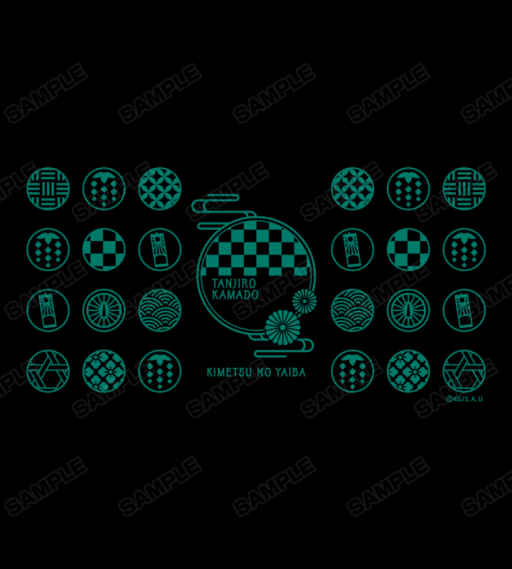 竈門炭治郎の羽織の柄、耳飾り、日輪刀の鍔、藤の花などを和風のモチーフと合わせてレイアウトしたデザインに仕上げています。