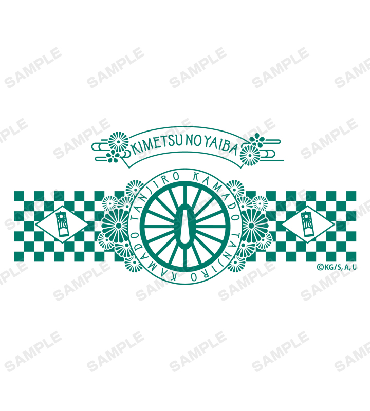 竈門炭治郎の日輪刀の鍔、耳飾り、羽織の柄、藤の花などを和風のモチーフと合わせてレイアウトしたデザインに仕上げています。