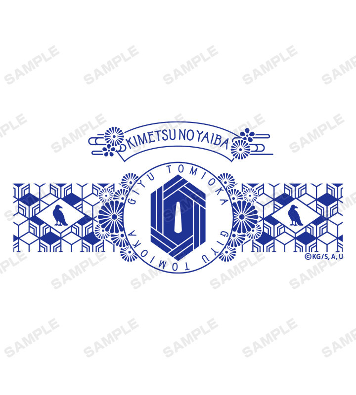 冨岡義勇の日輪刀の鍔、鎹鴉、羽織の柄、藤の花などを和風のモチーフと合わせてレイアウトしたデザインに仕上げています。