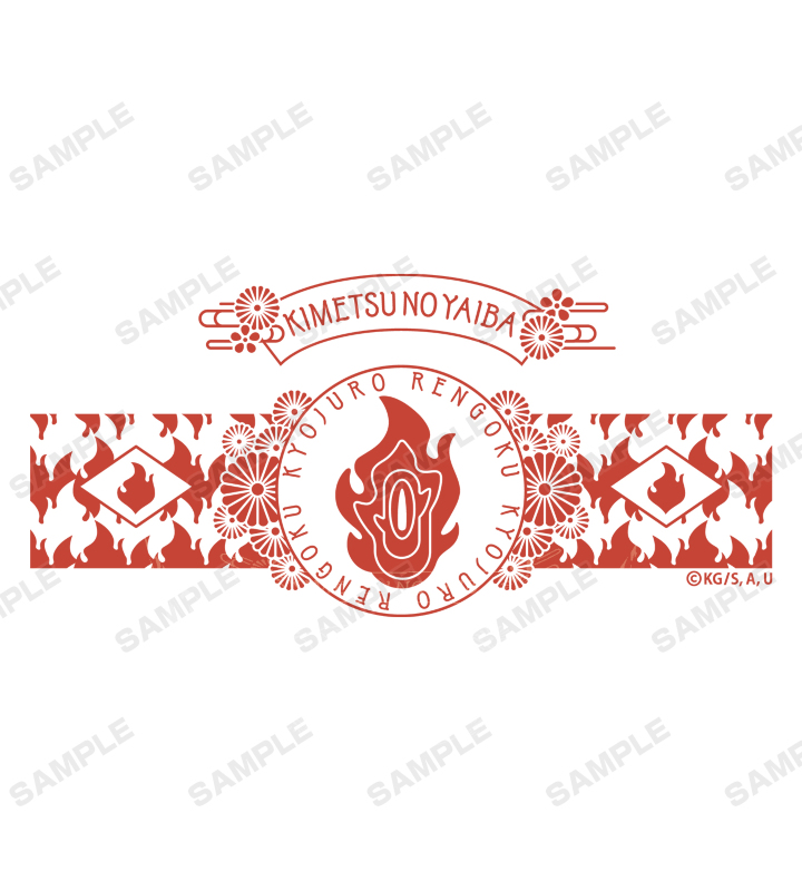 煉獄杏寿郎の日輪刀の鍔、炎の模様、羽織の柄、藤の花などを和風のモチーフと合わせてレイアウトしたデザインに仕上げています。