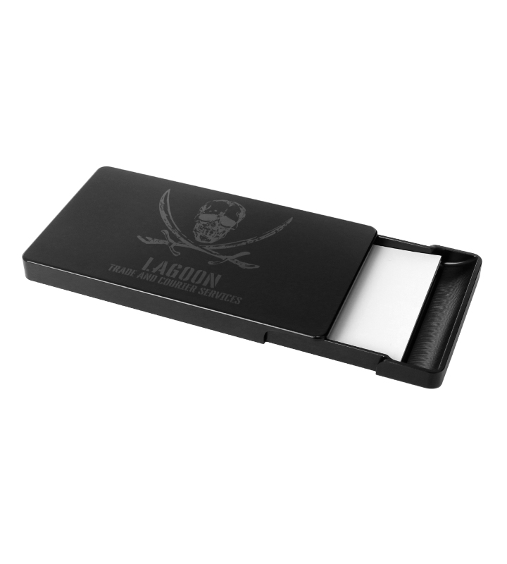 『BLACK LAGOON』×「GILD design」のコラボレーションアイテム「GILD design(ギルドデザイン) ジュラルミンカードケース ラグーン商会」の登場です。 GILD designは「スマートフォンを本気で守る」をコンセプトに、航空機や自動車部品に使用される高強度ジュラルミンの無垢材から削り出したアルミケースを製作するブランドです。 ラグーン商会をイメージしたロゴマークをレイアウトしたデザインに仕上げました。 本体内部機構では、取り出し口の3次元加工によりカードが取り出しやすくなっています。 ジュラルミンから削り出して製作したカードケースで、ビジネスシーンにもマッチするアイテムです。
