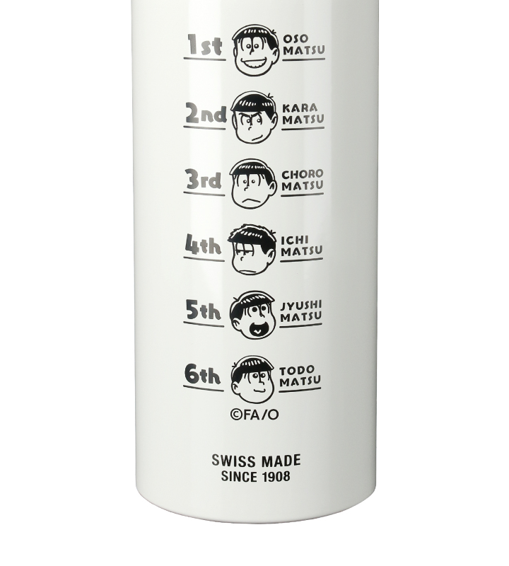 『おそ松さん』×「SIGG」のコラボレーションアイテム「SIGGコラボ トラベラーボトル」の登場です。 SIGG(シグ)は、ボトルの専門メーカーとして、スイスの自社工場で生産・管理を行い、丈夫で衛生面に優れた性能と品質により高い評価を得るブランドです。 おそ松、カラ松、チョロ松、一松、十四松、トド松と松マークをレイアウトしたデザインに仕上げました。 素材は良質なアルミプレートで軽量で丈夫、持ち運びに優れています。