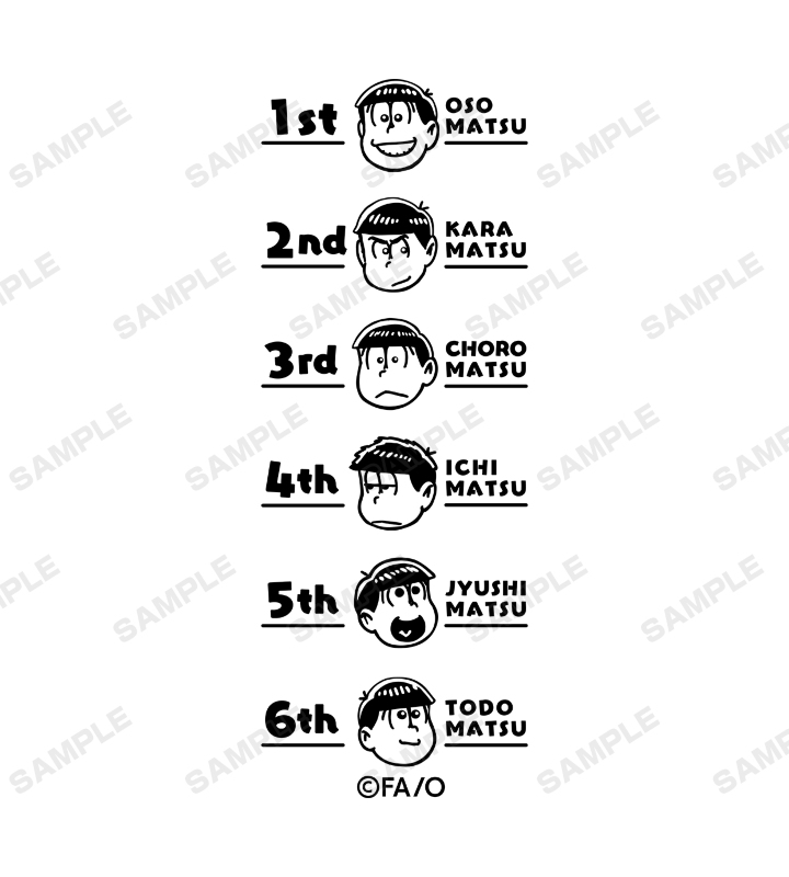 おそ松、カラ松、チョロ松、一松、十四松、トド松と松マークをレイアウトしたデザインに仕上げました。