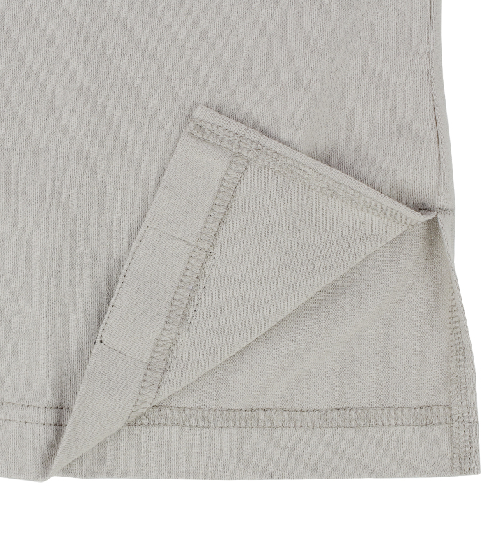 肩をドロップさせたビッグシルエットでゆったりした印象と抜け感が特徴で、裾に入ったスリットやタグがデザインのアクセントになったアイテムです。