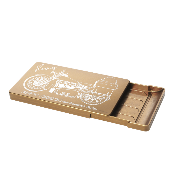 『キノの旅 -the Beautiful World- the Animated Series』×「GILD design」のコラボレーションアイテム「GILD design ジュラルミンカードケース」の登場です。 GILD designは「スマートフォンを本気で守る」をコンセプトに、航空機や自動車部品に使用される高強度ジュラルミンの無垢材から削り出したアルミケースを製作するブランドです。 キノの相棒であるモトラドのエルメスや作品タイトルをレイアウトしたデザインに仕上げました。 本体内部機構では、取り出し口の3次元加工によりカードが取り出しやすくなっています。 ジュラルミンから削り出して製作したカードケースで、ビジネスシーンにもマッチするアイテムです。