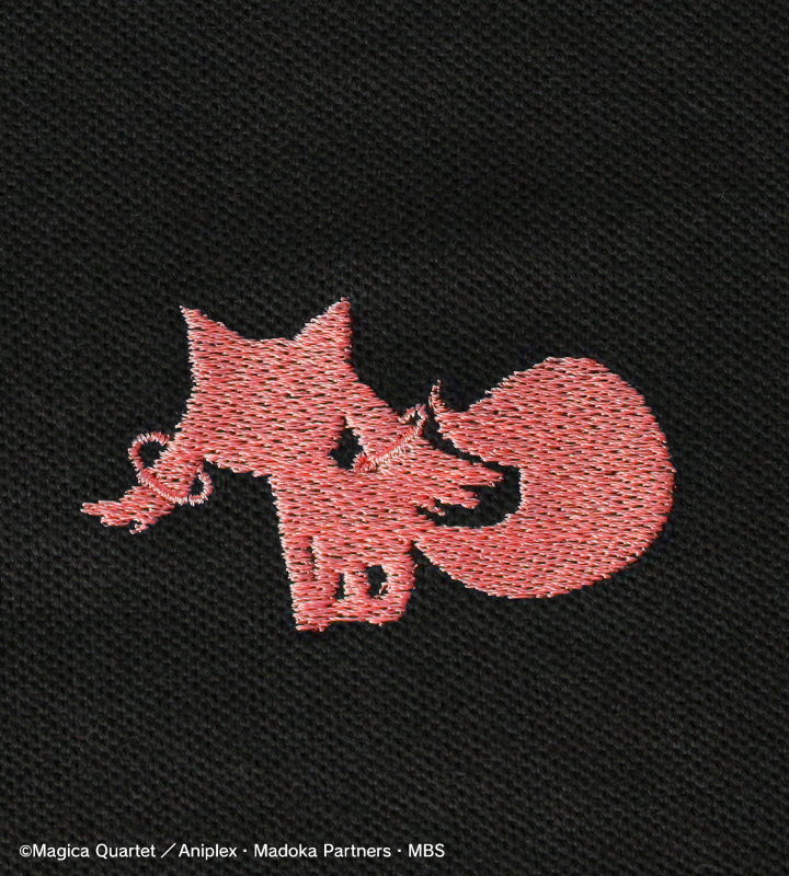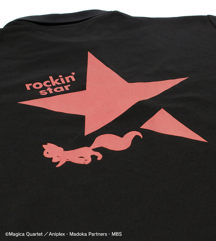 背面には大きくロッキンスターとのコラボロゴをプリントし、胸元にはキュゥべえのシルエットを刺繍で施しています。
