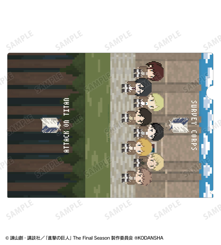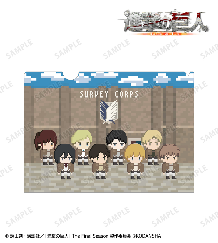 エレン 、ミカサ 、アルミン 、ジャン 、サシャ 、エルヴィン 、リヴァイ 、ライナーをドット絵風に描き起こしたイラストをメインにデザインしました。
