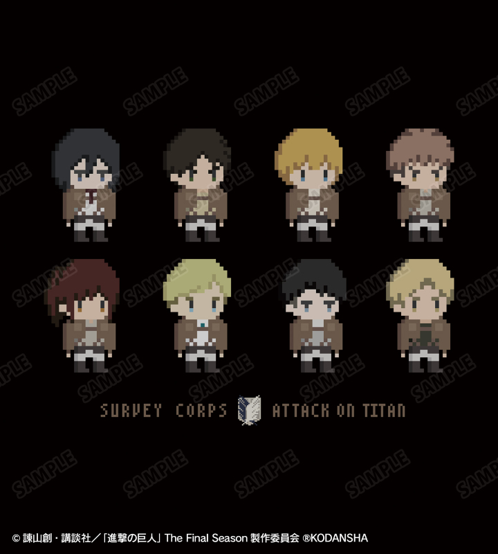 エレン 、ミカサ 、アルミン 、ジャン 、サシャ 、エルヴィン 、リヴァイ 、ライナーをドット絵風に描き起こしたイラストをメインにデザインしました。
