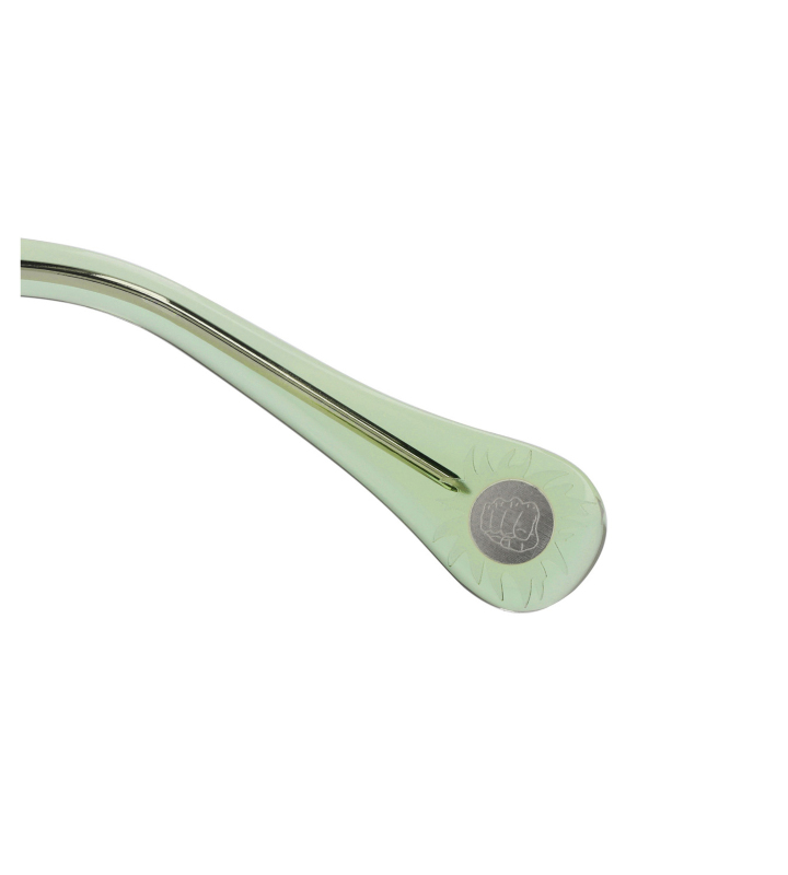 テンプルエンドにはジャジャン拳のメタルプレートや、オーラをイメージした模様があしらわれている。