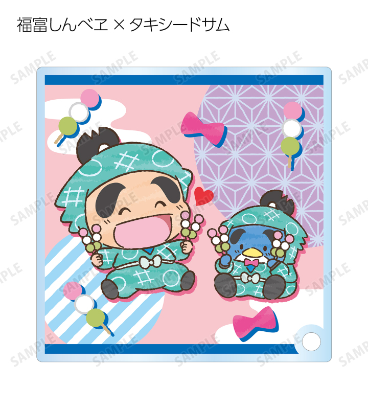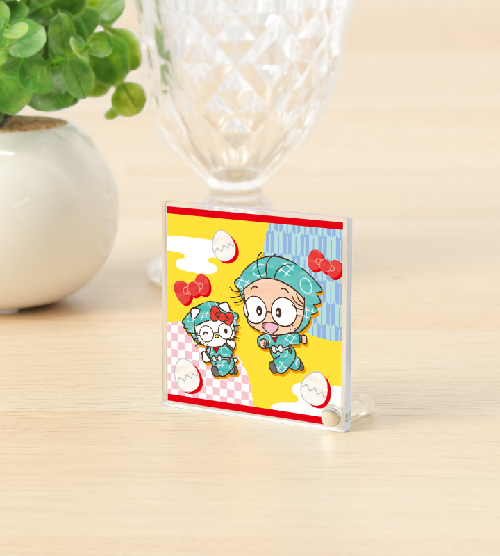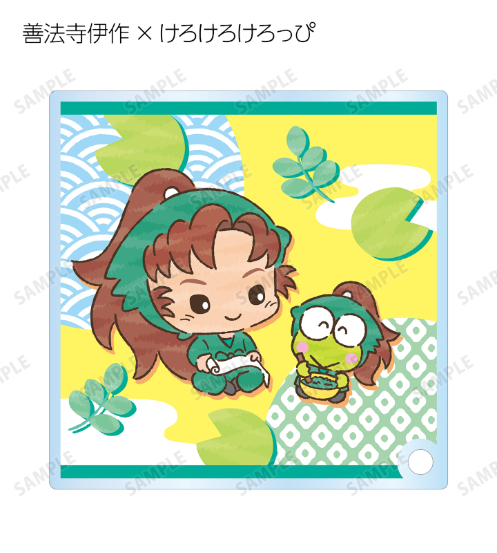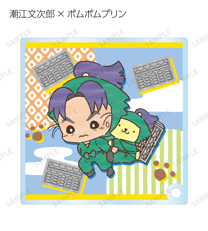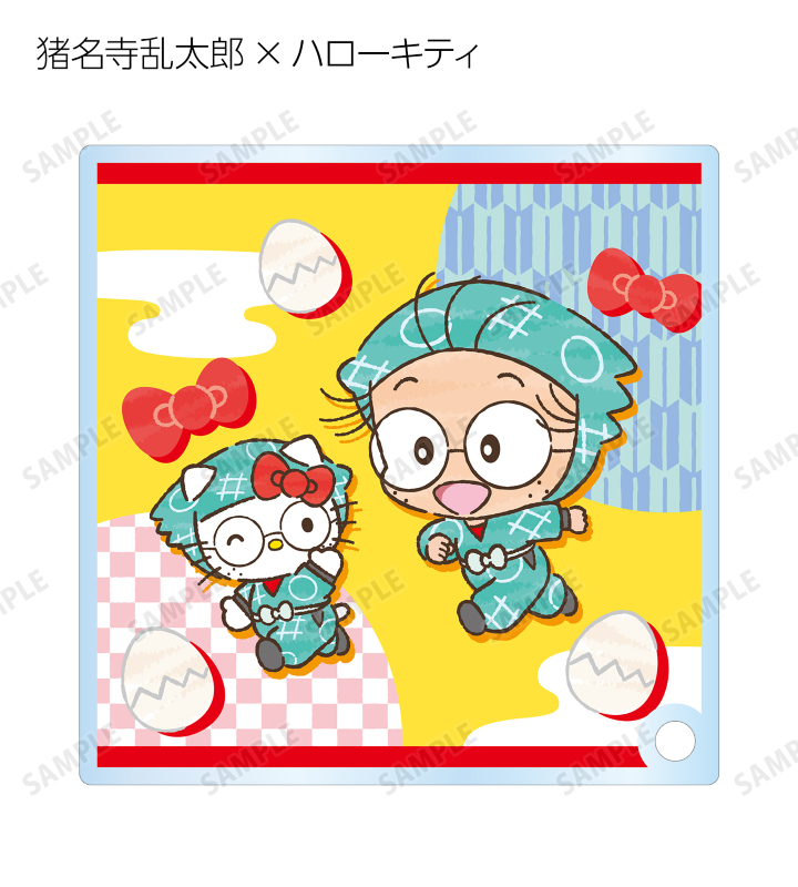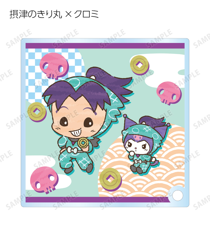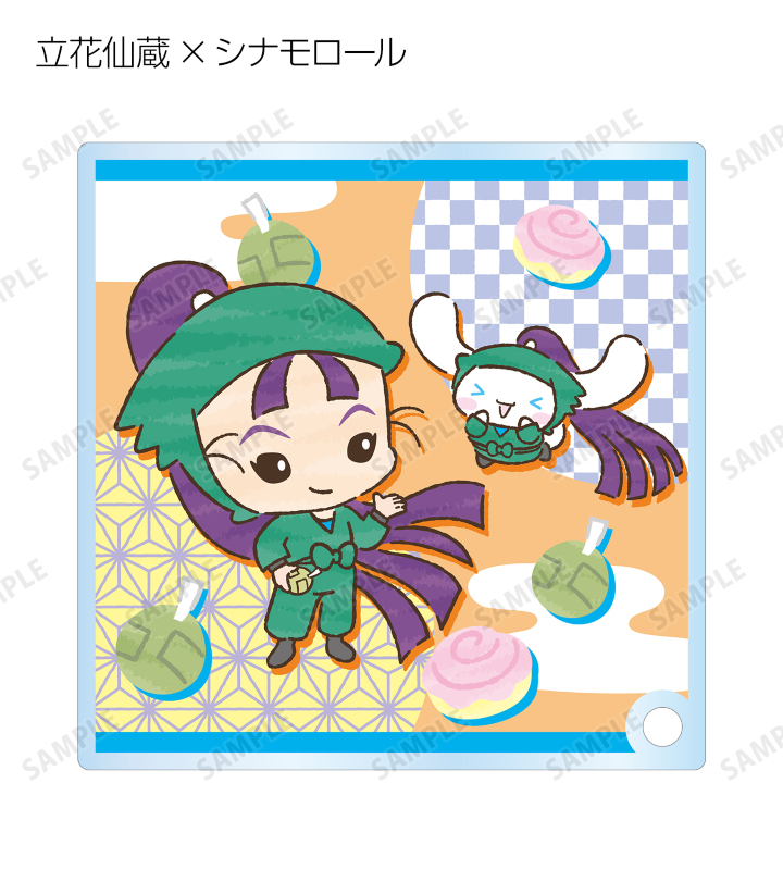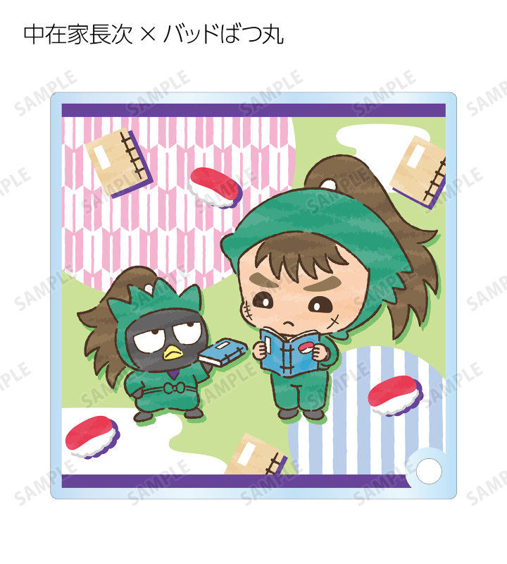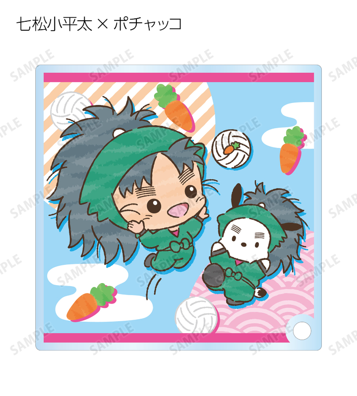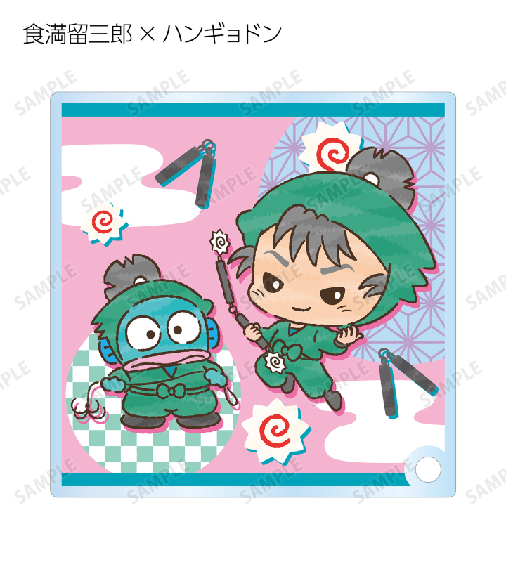 猪名寺乱太郎×ハローキティ、摂津のきり丸×クロミ、福富しんべヱ×タキシードサム、潮江文次郎×ポムポムプリン、立花仙蔵×シナモロール、中在家長次×バッドばつ丸、七松小平太×ポチャッコ、善法寺伊作×けろけろけろっぴ、食満留三郎×ハンギョドンを手のひらサイズのアクリルパネルに仕上げました。