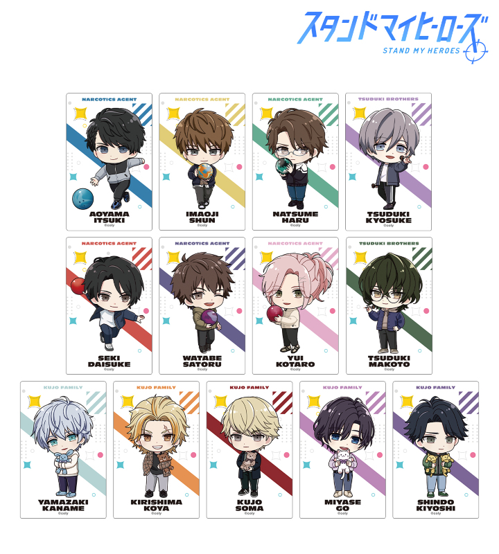青山樹、今大路峻、夏目春、関大輔、渡部悟、由井孝太郎、都築京介、都築誠、山崎カナメ、桐嶋宏弥、九条壮馬、宮瀬豪、新堂清志のちびキャライラストをカードステッカーに仕上げました。