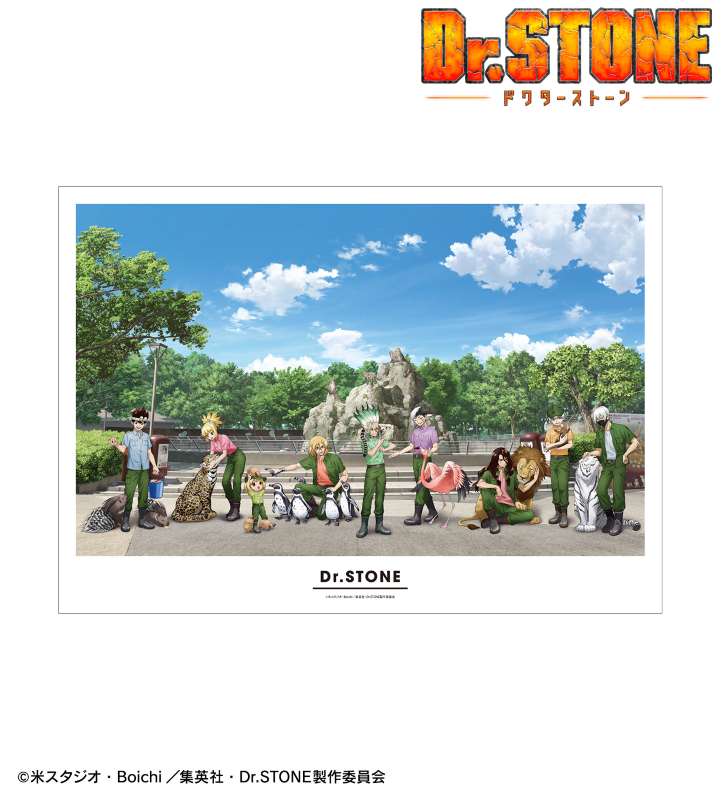 TVアニメ「Dr.STONE」×「東武動物公園」のコラボレーションアイテム「描き下ろし 集合 飼育係ver. A3マット加工ポスター」の登場です。