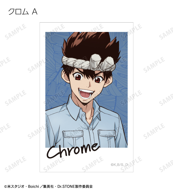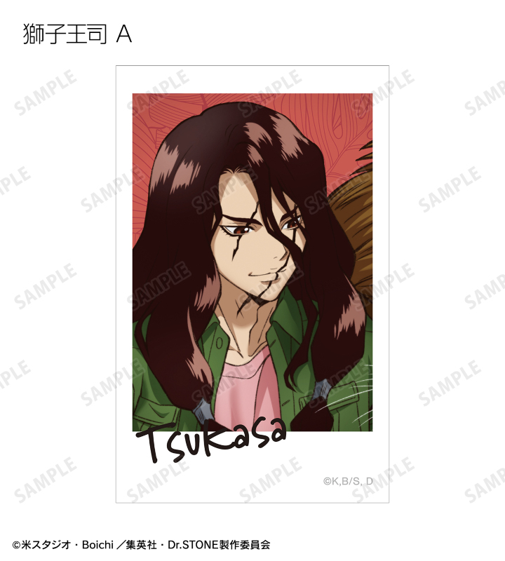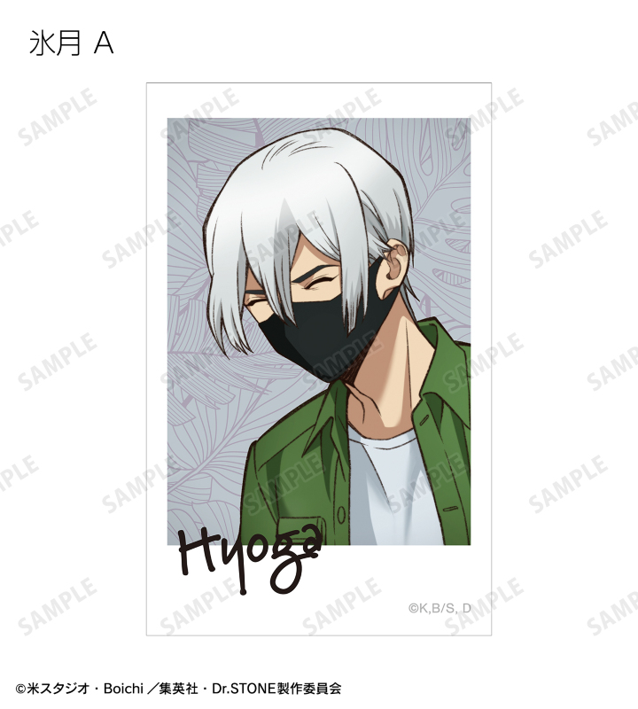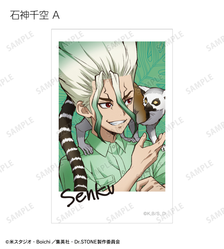 石神千空、あさぎりゲン、七海龍水、クロム、西園寺羽京、コハク、スイカ、獅子王司、氷月の描き下ろしイラストをイラストカードに仕上げました。