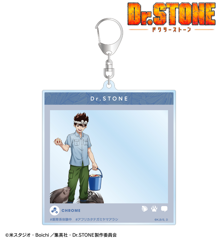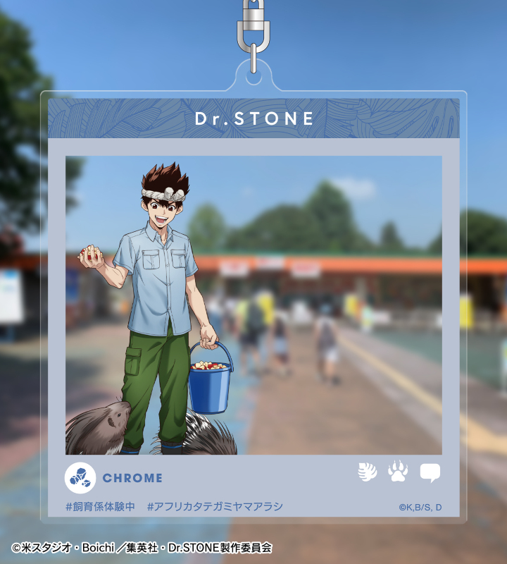 TVアニメ「Dr.STONE」×「東武動物公園」のコラボレーションアイテム「描き下ろし クロム 飼育係ver. SNS風BIGアクリルキーホルダー」の登場です。