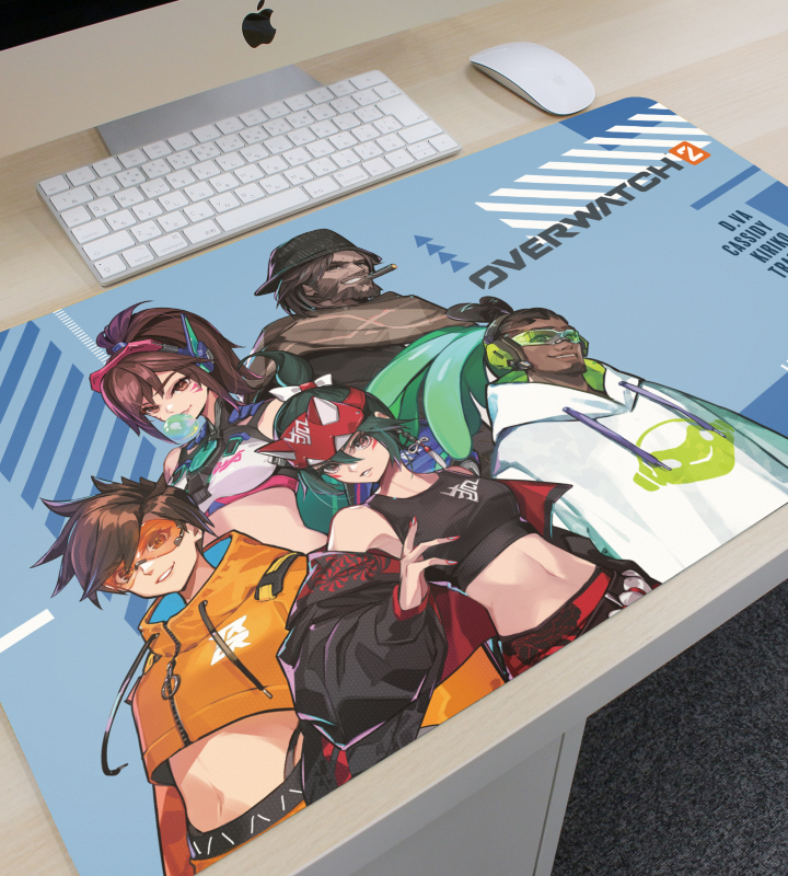 POKImariさん描き起こしイラストのD.Va、キャスディ、キリコ、トレーサー、ルシオをマルチデスクマットに仕上げました。