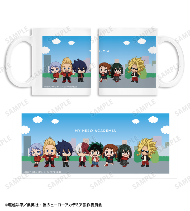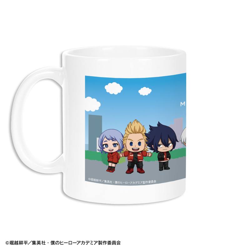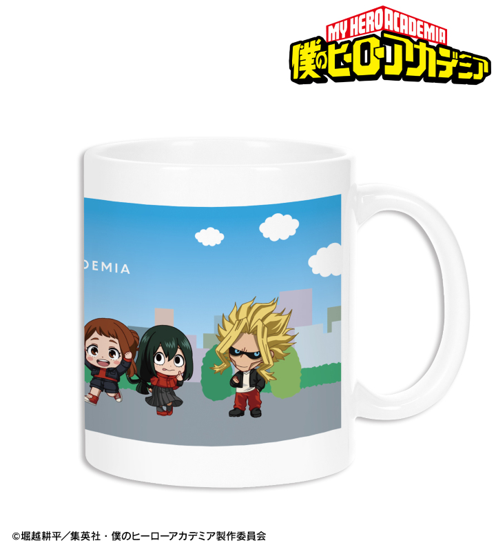 緑谷出久、麗日お茶子、轟焦凍、蛙吹梅雨、通形ミリオ、天喰環、波動ねじれ、オールマイトのちびキャラビジュアルをマグカップに仕上げました。