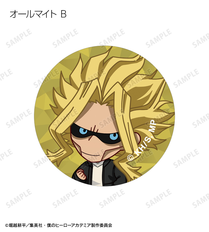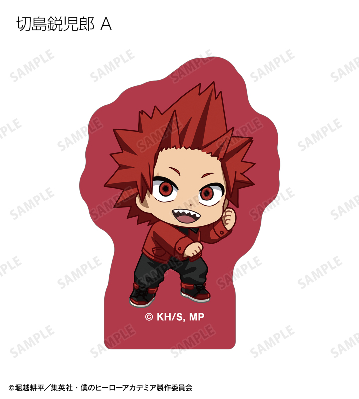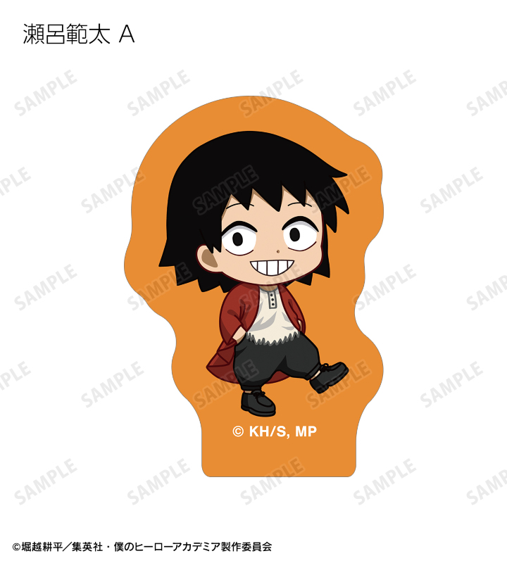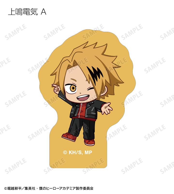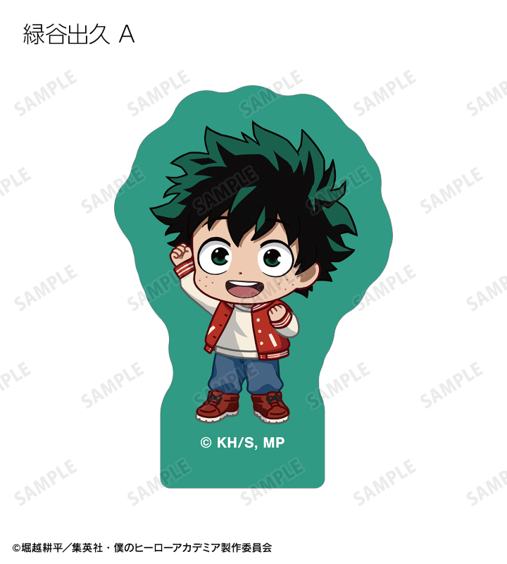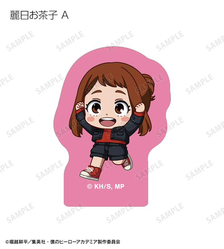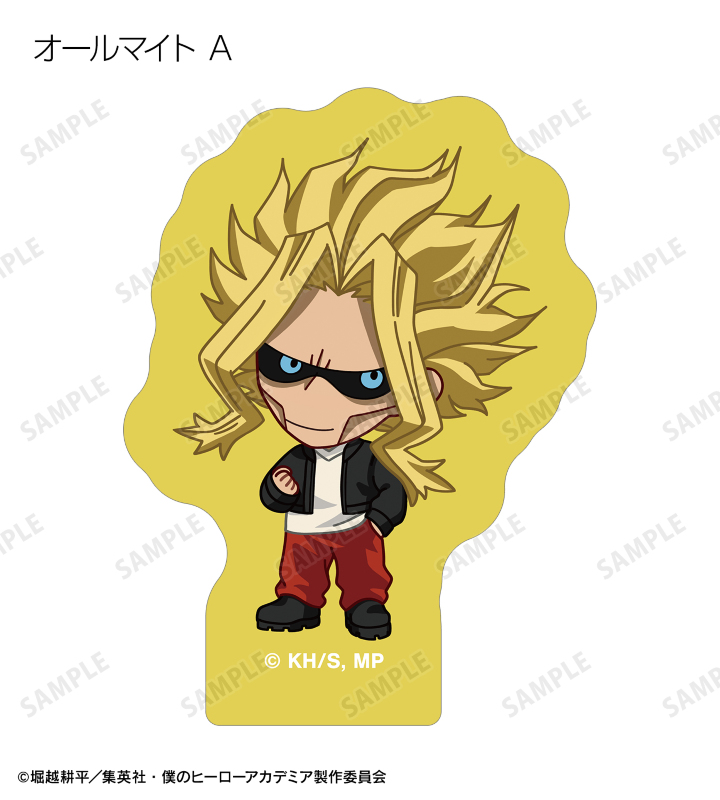緑谷出久、爆豪勝己、麗日お茶子、轟焦凍、蛙吹梅雨、切島鋭児郎、上鳴電気、耳郎響香、瀬呂範太、通形ミリオ、天喰環、波動ねじれ、心操人使、オールマイト、相澤消太のちびキャラビジュアルをフレークシールに仕上げました。