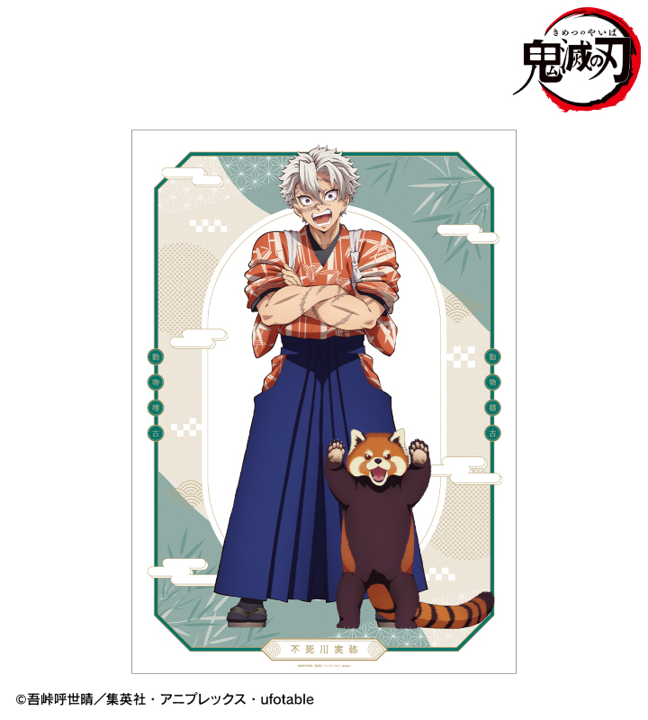 アニメ「鬼滅の刃」から「東武動物公園」のオリジナルアイテム「描き下ろし 不死川実弥 動物稽古ver. A3マット加工ポスター」の登場です。