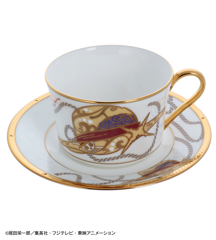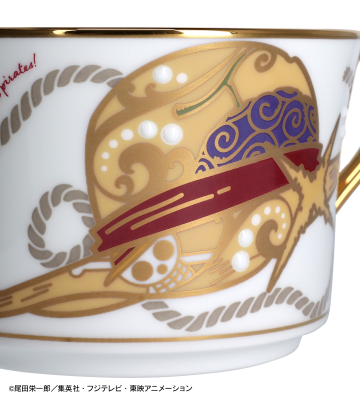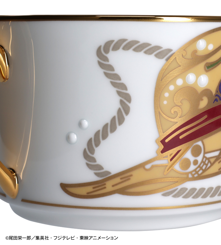 ルフィのシルエット、モチーフや文字をはじめ、カップの口線、取手、ソーサーの淵にも金を使用しており、また、カップは水の飛沫、ソーサーは波を、立体的に表現したリッチな仕様となっております。