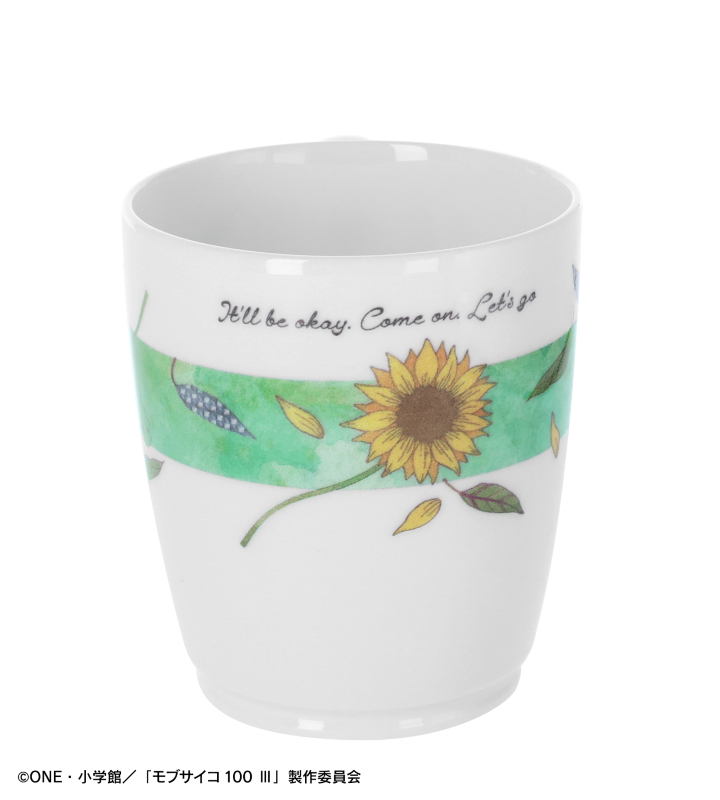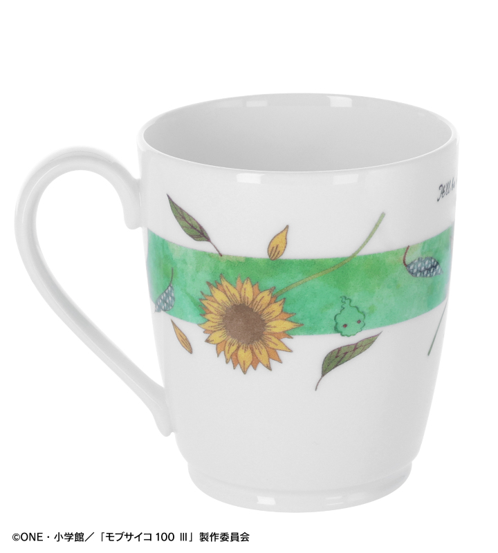 影山茂夫をイメージした、最終話に登場する花とキャラカラーの緑色が印象的でカジュアルなマグカップです。