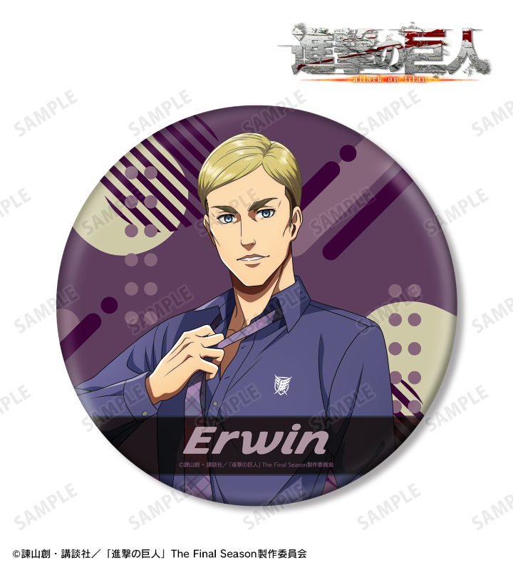 TVアニメ『進撃の巨人』×「ROUND1」のコラボレーションアイテム「描き下ろし エルヴィン レトロ風ファッションver. BIG缶バッジ」の登場です。
