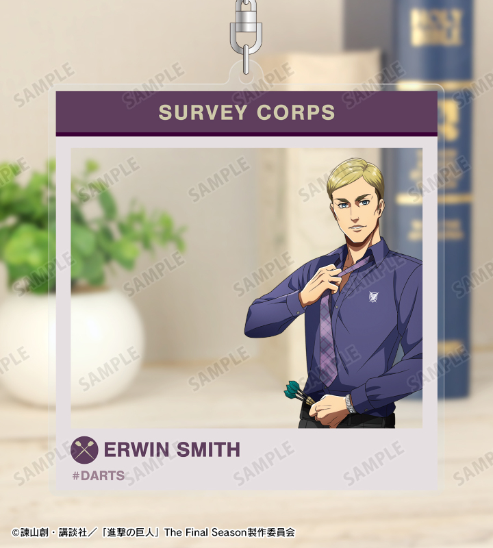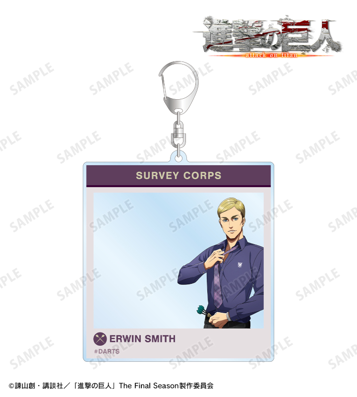 エルヴィンの描き下ろしイラスト、キャラクターの名前、調査兵団の英字、ダーツの文字をSNS風のBIGなアクリルキーホルダーに仕上げました。