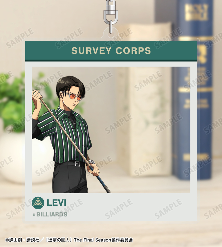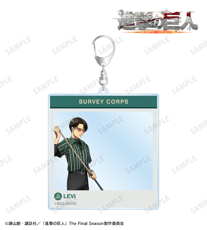 リヴァイの描き下ろしイラスト、キャラクターの名前、調査兵団の英字、ビリヤードの文字SNS風のBIGなアクリルキーホルダーに仕上げました。