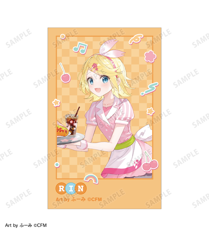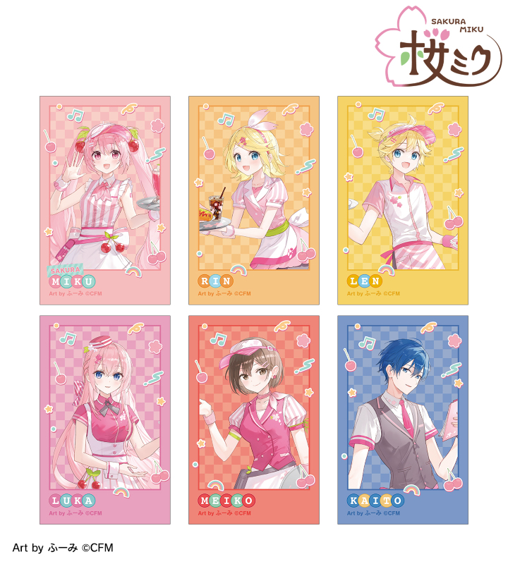 ふーみさん描き下ろしイラストの桜ミク、鏡音リン、鏡音レン、巡音ルカ、MEIKO、KAITOをイラストカードに仕上げました。