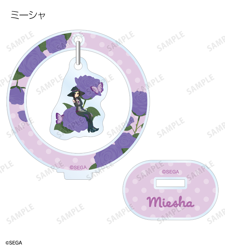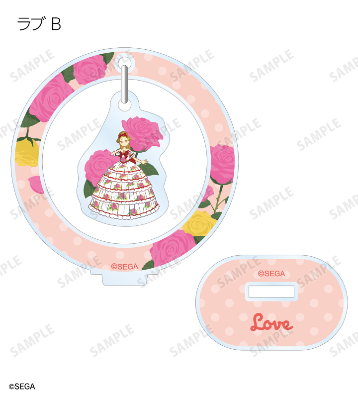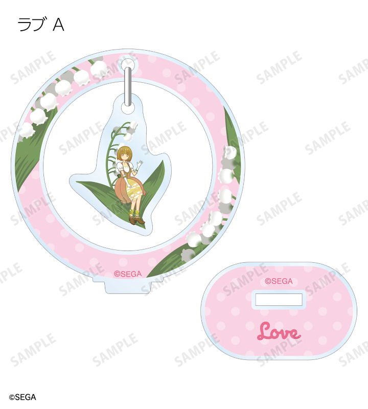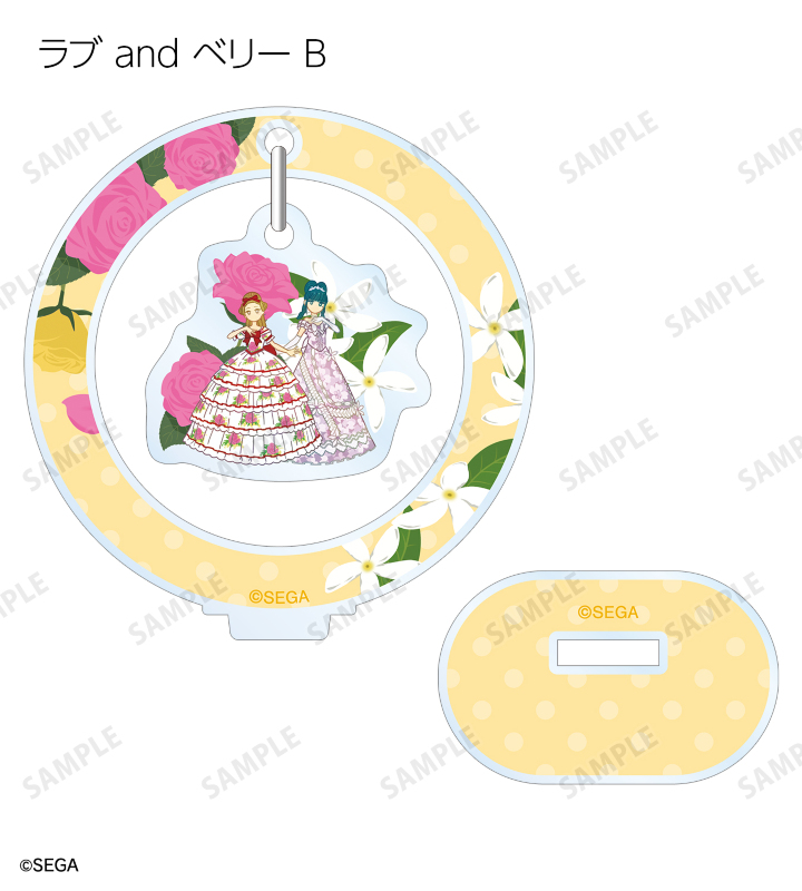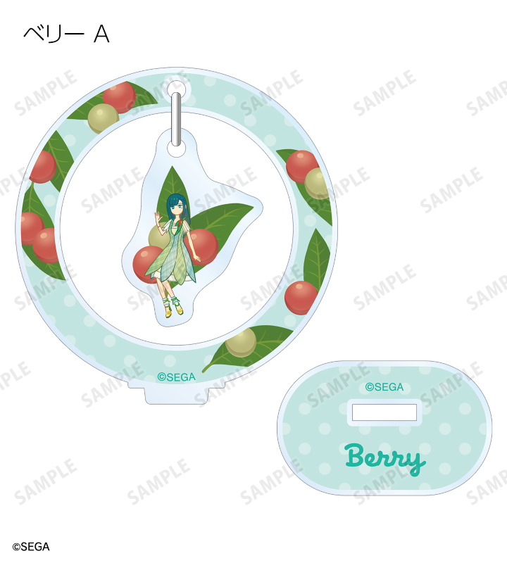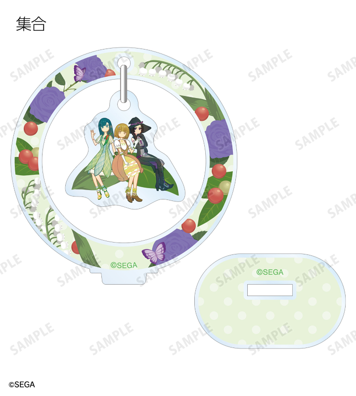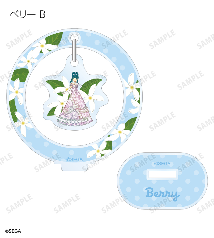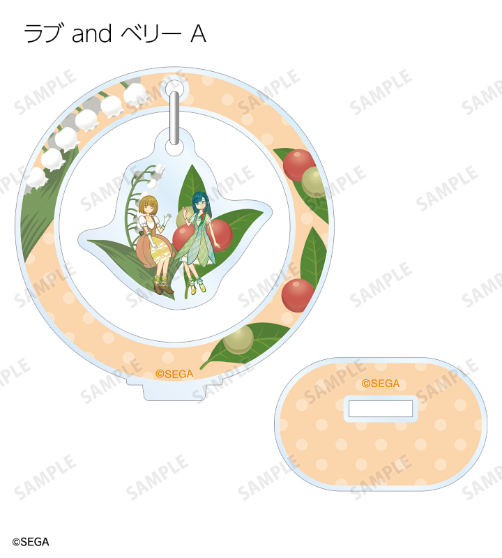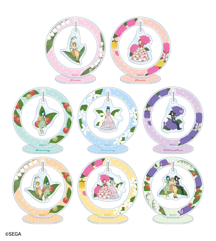 ラブ、ベリー、ミーシャのイラストをボタニカルデザインに落とし込んで繊細なタッチで新たに描き起こし、ゆらゆら動くアクリルスタンドに仕上げました。