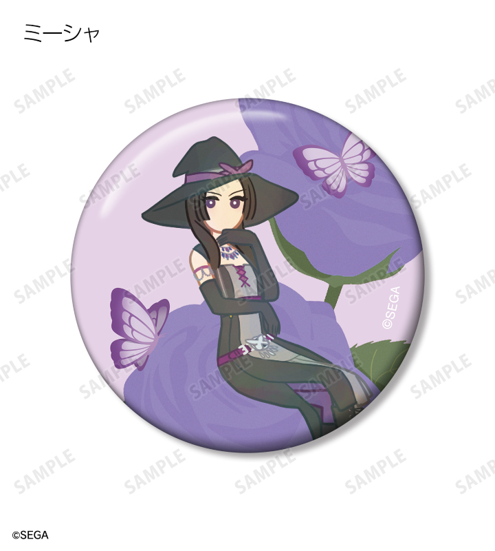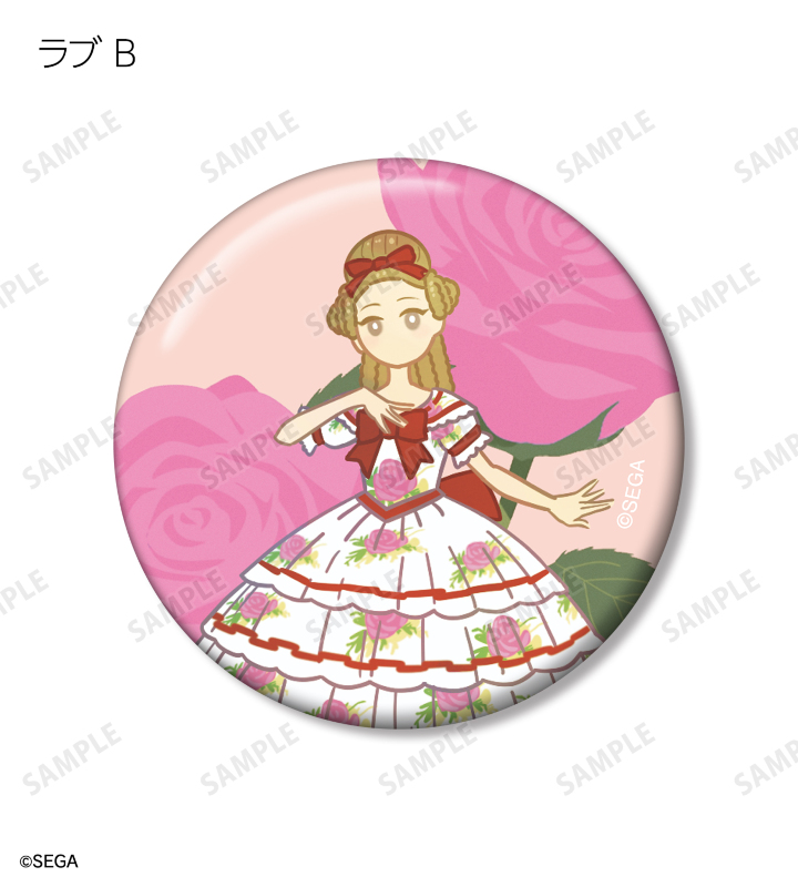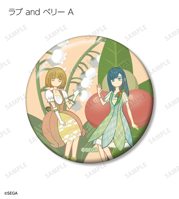 ラブ、ベリー、ミーシャのイラストをボタニカルデザインに落とし込んで繊細なタッチで新たに描き起こし、缶バッジに仕上げました。