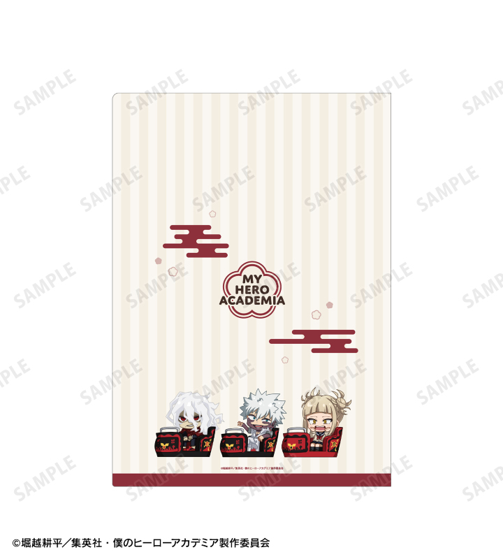 緑谷出久、爆豪勝己、麗日お茶子、飯田天哉、轟焦凍、蛙吹梅雨、切島鋭児郎、上鳴電気、耳郎響香、物間寧人、心操人使、相澤消太、死柄木弔、荼毘、トガヒミコのちびキャラビジュアルをクリアファイルに仕上げました。