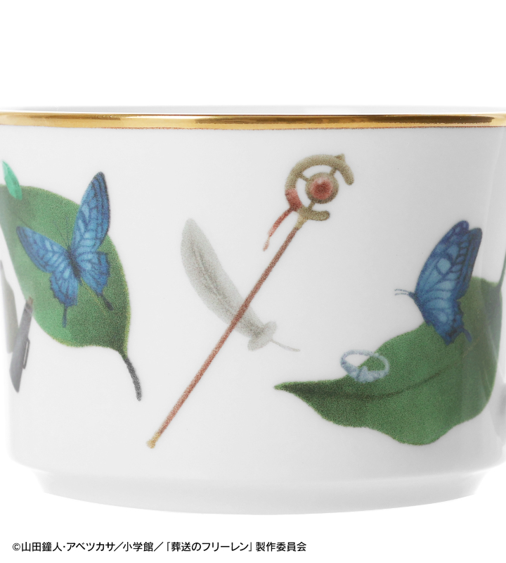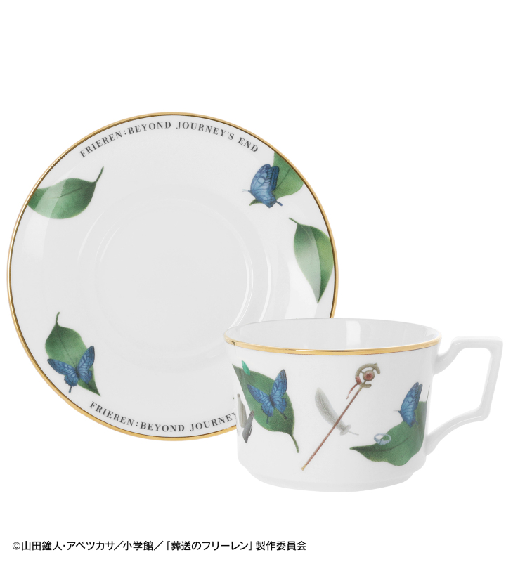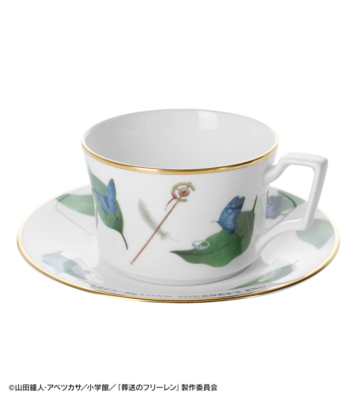 フリーレンの旅のお供でもある大きなカバンと青い蝶がポイントの、日常使いしやすいデザインのカップ&ソーサーです。