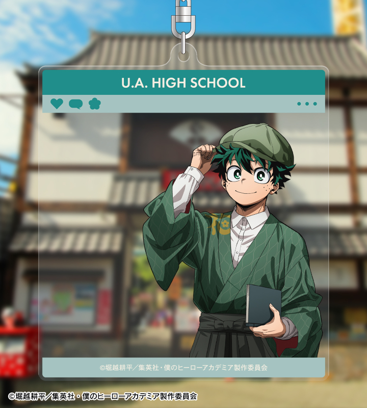 TVアニメ『僕のヒーローアカデミア』×「浅草花やしき」のコラボレーションアイテム「描き下ろし 緑谷出久 花やしきver. SNS風BIGアクリルキーホルダー」の登場です。