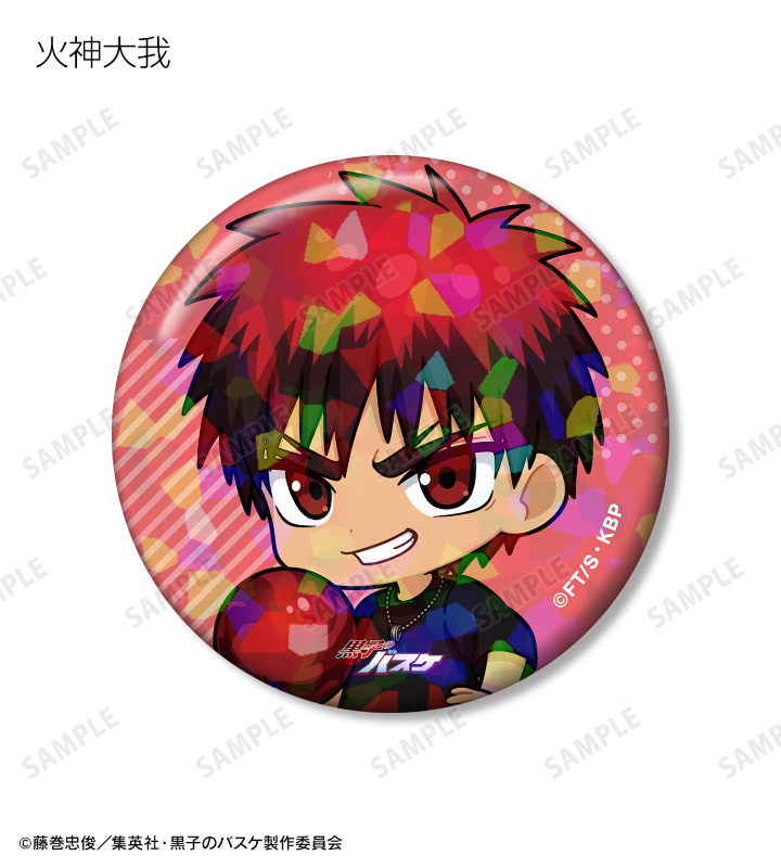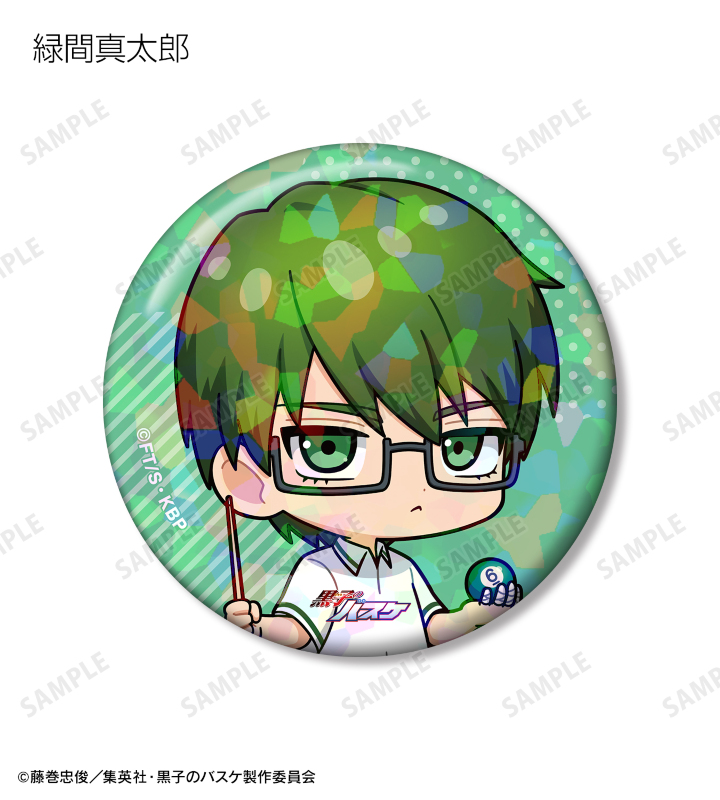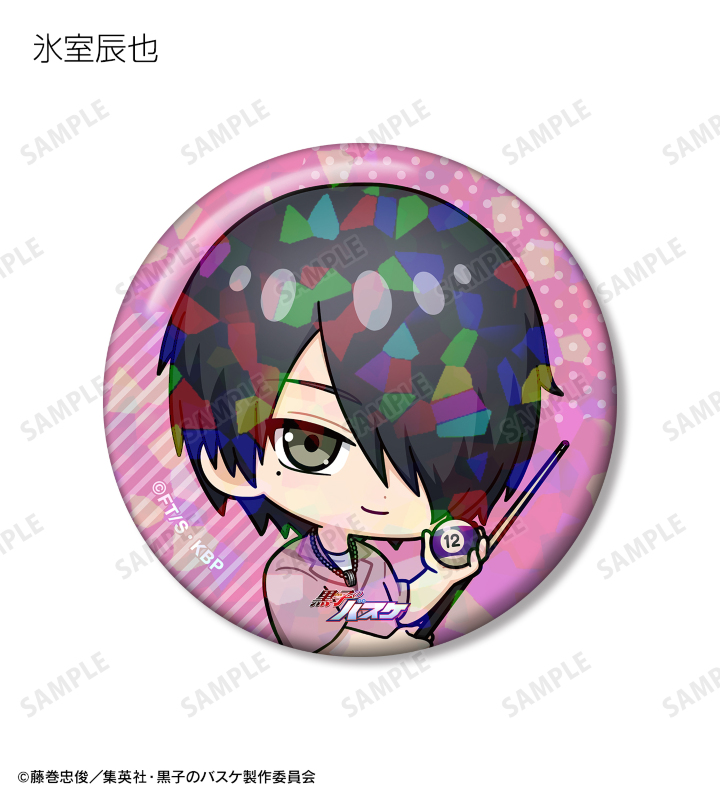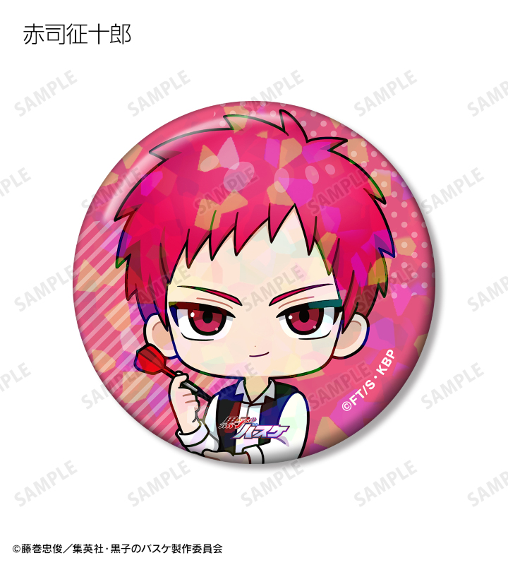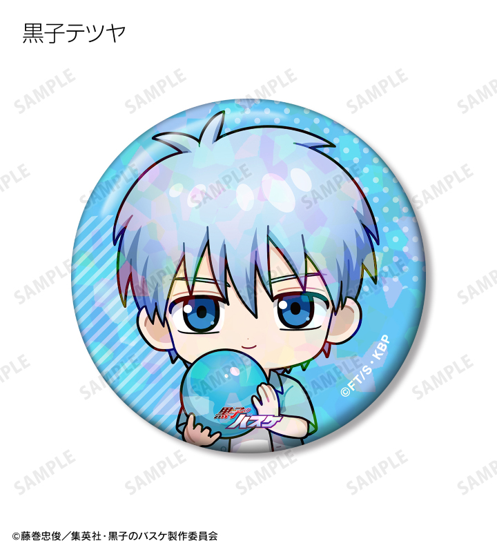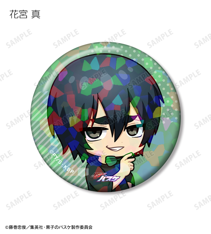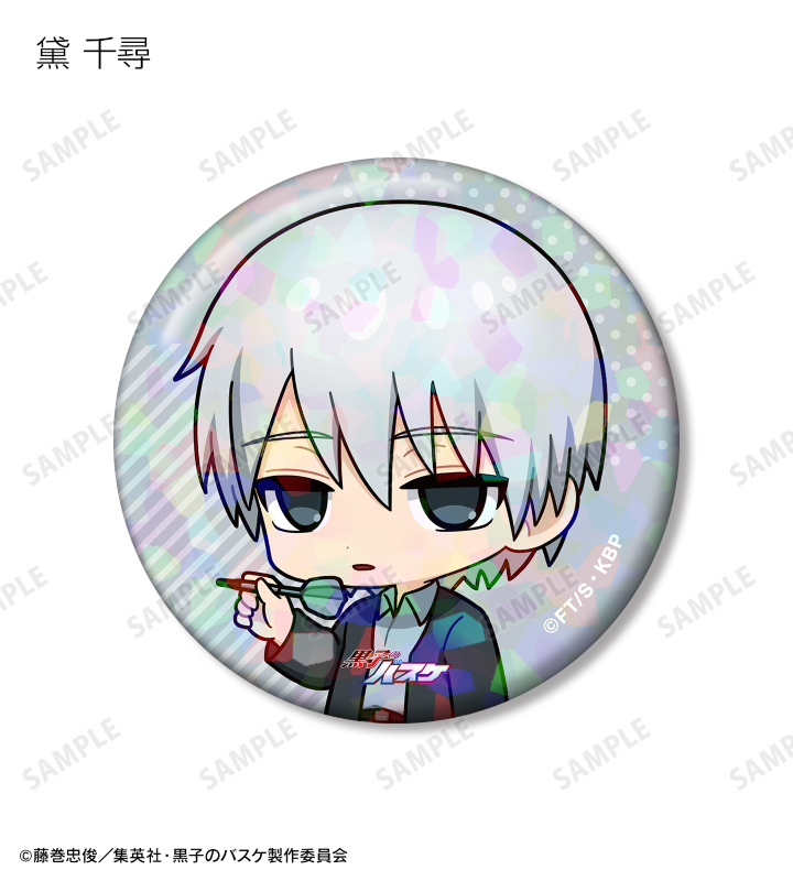 黒子テツヤ、火神大我、テツヤ2号、黄瀬涼太、笠松幸男、緑間真太郎、高尾和成、青峰大輝、桃井さつき、紫原 敦、氷室辰也、赤司征十郎、黛 千尋、花宮 真の描き起こしちびキャライラストをメインにデザインし、ホログラム加工を施した缶バッジに仕上げました。