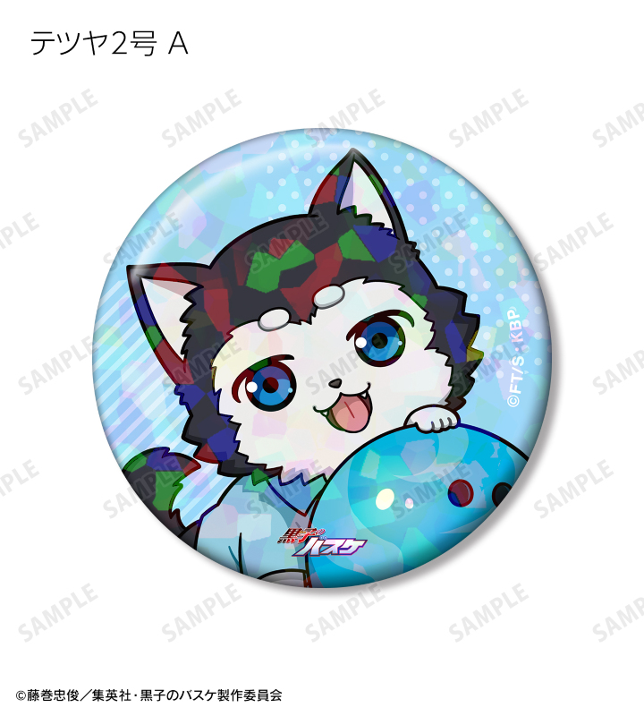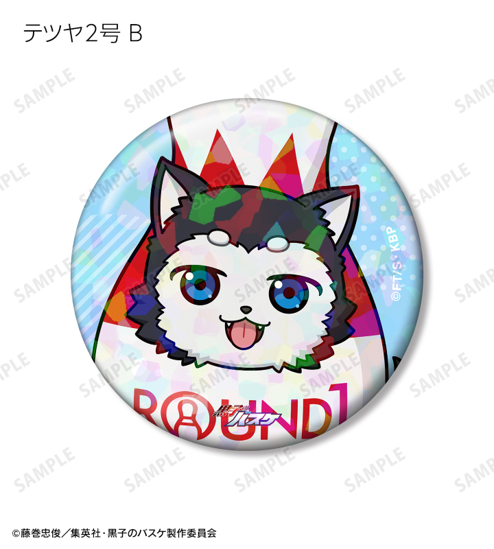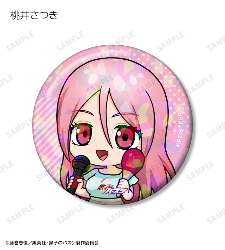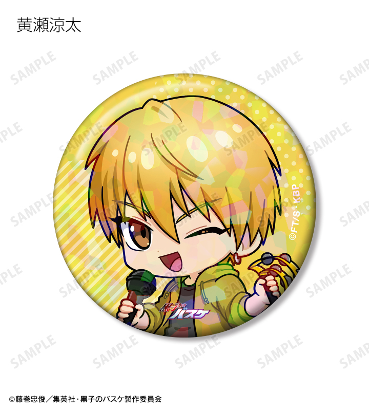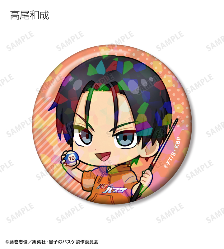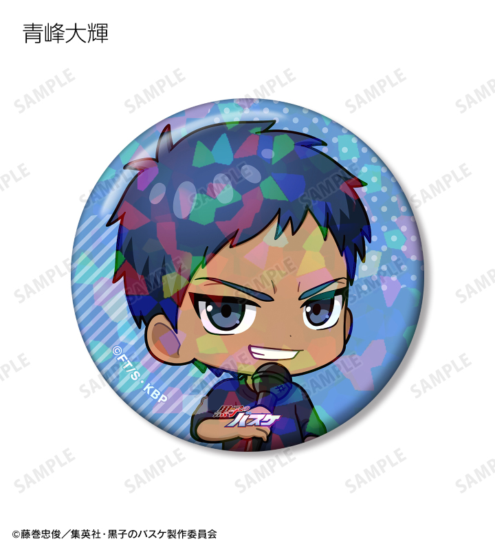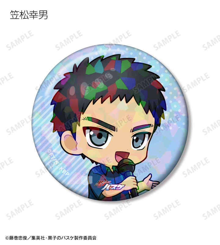 黒子テツヤ、火神大我、テツヤ2号、黄瀬涼太、笠松幸男、緑間真太郎、高尾和成、青峰大輝、桃井さつき、紫原 敦、氷室辰也、赤司征十郎、黛 千尋、花宮 真の描き起こしちびキャライラストをメインにデザインし、ホログラム加工を施した缶バッジに仕上げました。