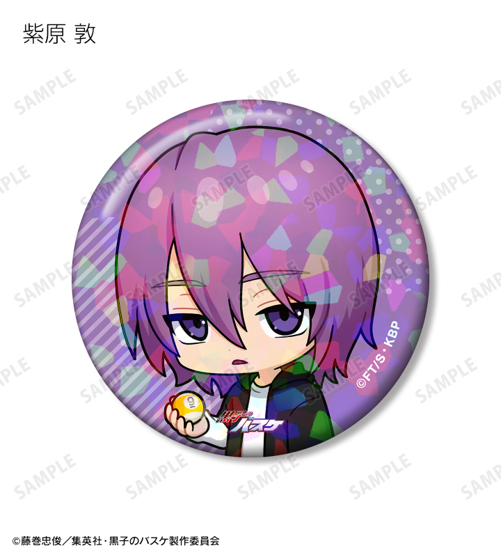 黒子テツヤ、火神大我、テツヤ2号、黄瀬涼太、笠松幸男、緑間真太郎、高尾和成、青峰大輝、桃井さつき、紫原 敦、氷室辰也、赤司征十郎、黛 千尋、花宮 真の描き起こしちびキャライラストをメインにデザインし、ホログラム加工を施した缶バッジに仕上げました。 ※2025年11月26日までに