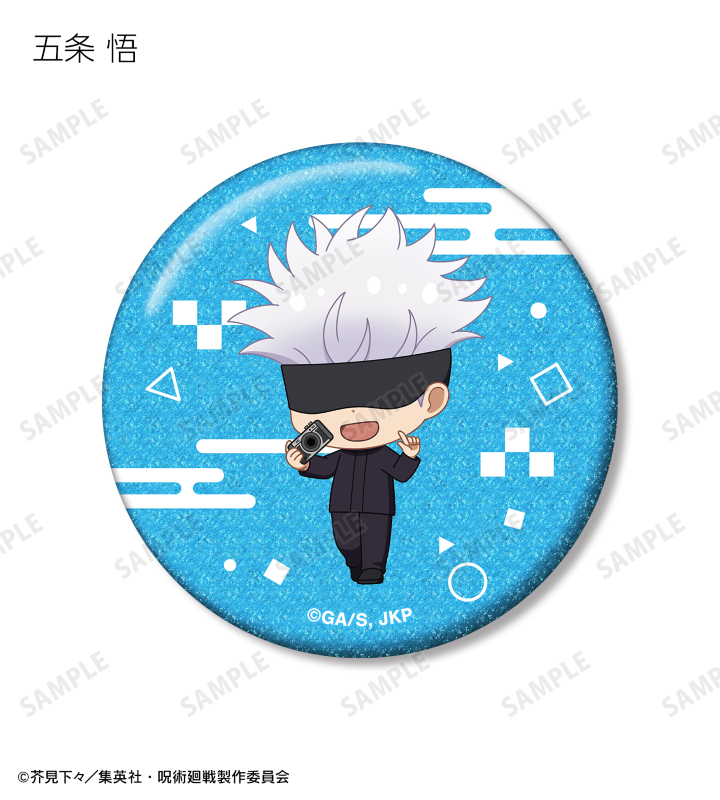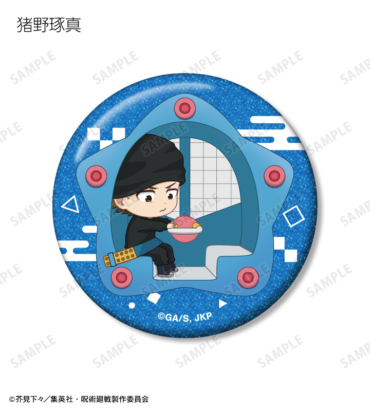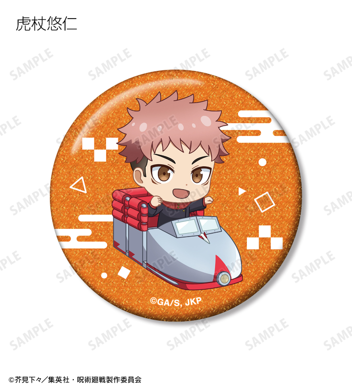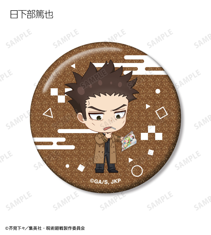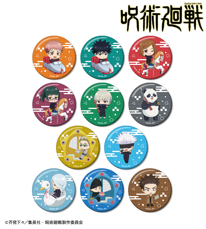 虎杖悠仁、伏黒 恵、釘崎野薔薇、禪院真希、狗巻 棘、パンダ、七海建人、五条 悟、冥冥、猪野琢真、日下部篤也の描き起こしちびキャライラストをメインにデザインし、グリッター加工を施した缶バッジに仕上げました。