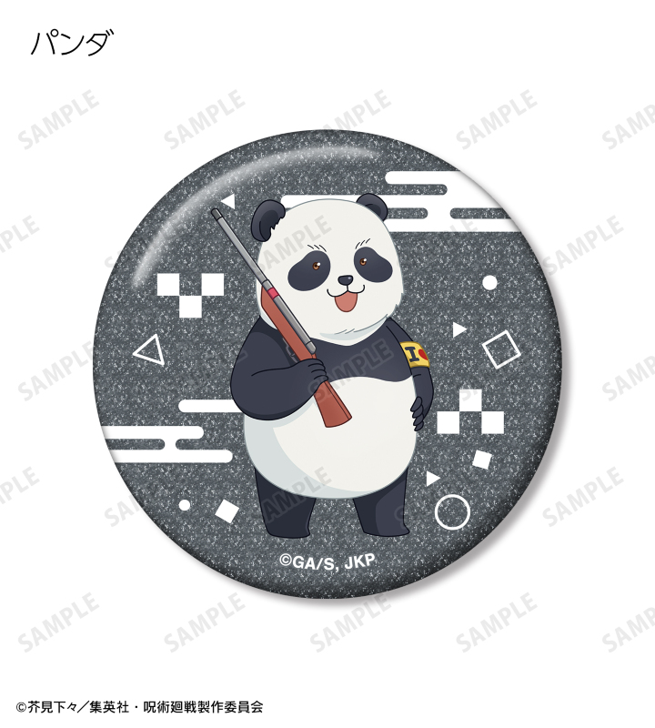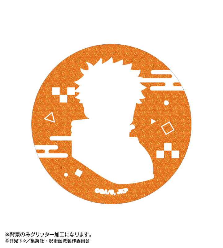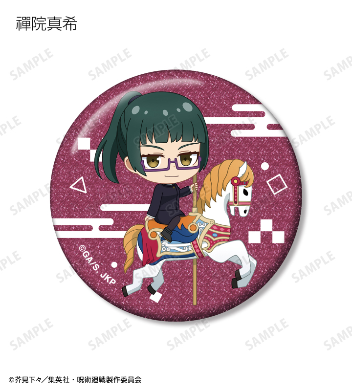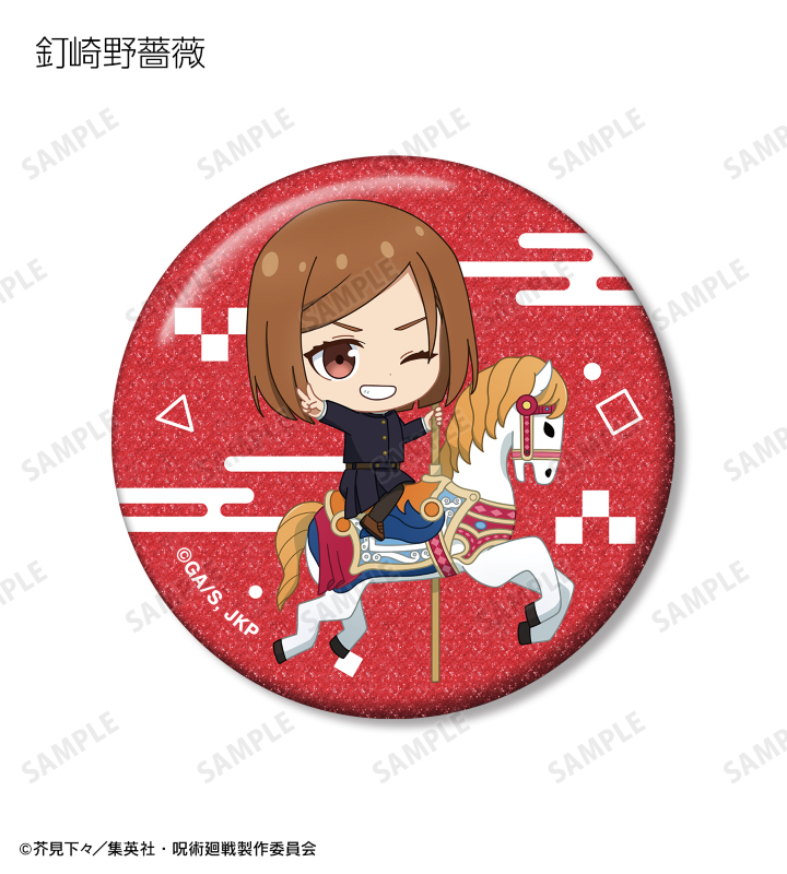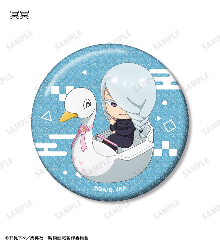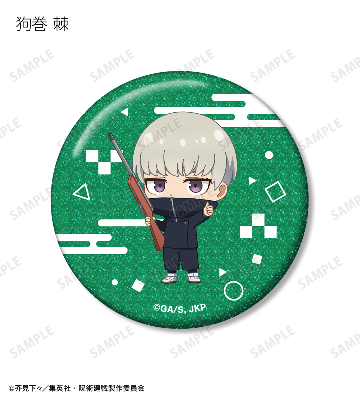 虎杖悠仁、伏黒 恵、釘崎野薔薇、禪院真希、狗巻 棘、パンダ、七海建人、五条 悟、冥冥、猪野琢真、日下部篤也の描き起こしちびキャライラストをメインにデザインし、グリッター加工を施した缶バッジに仕上げました。