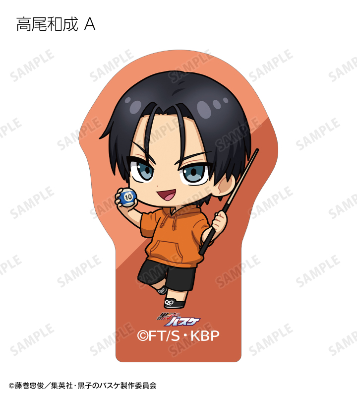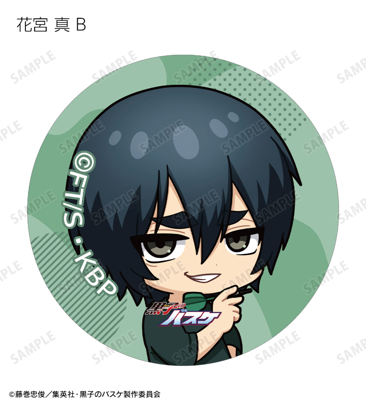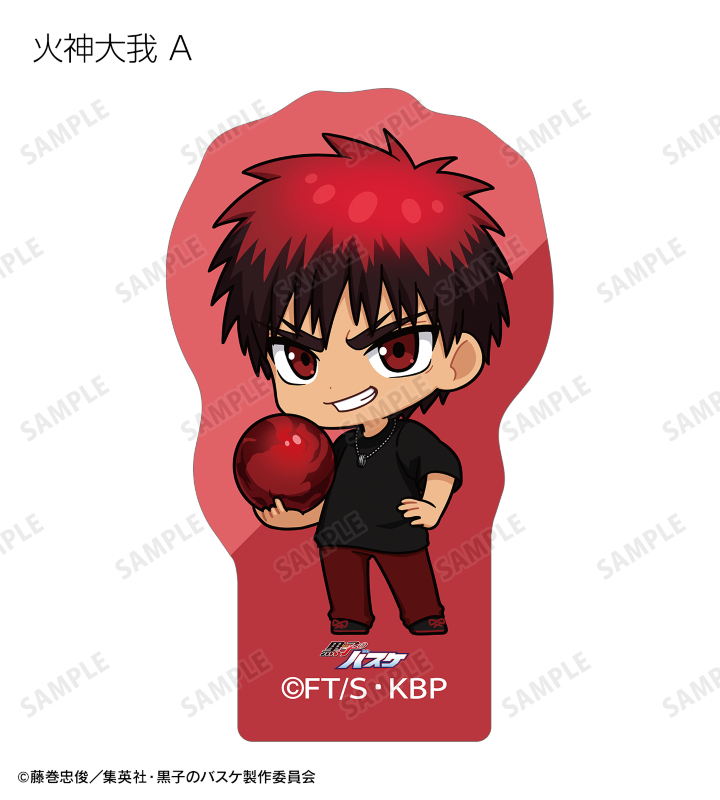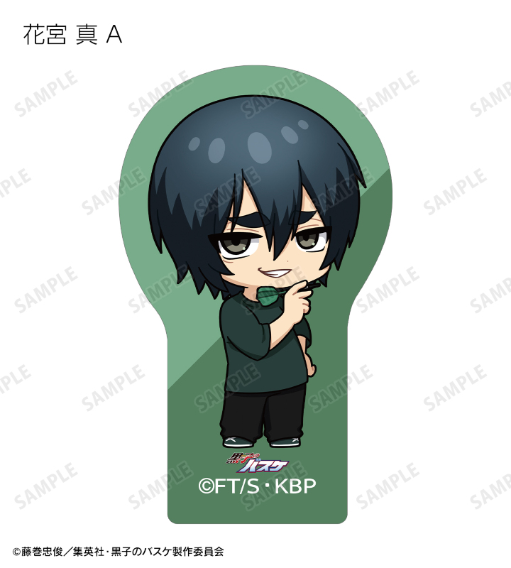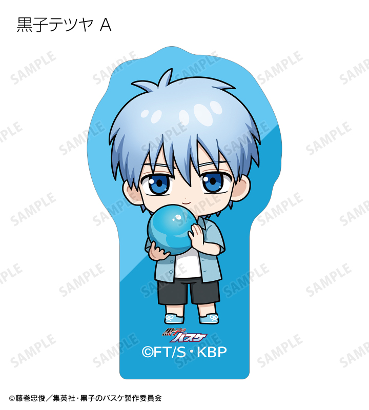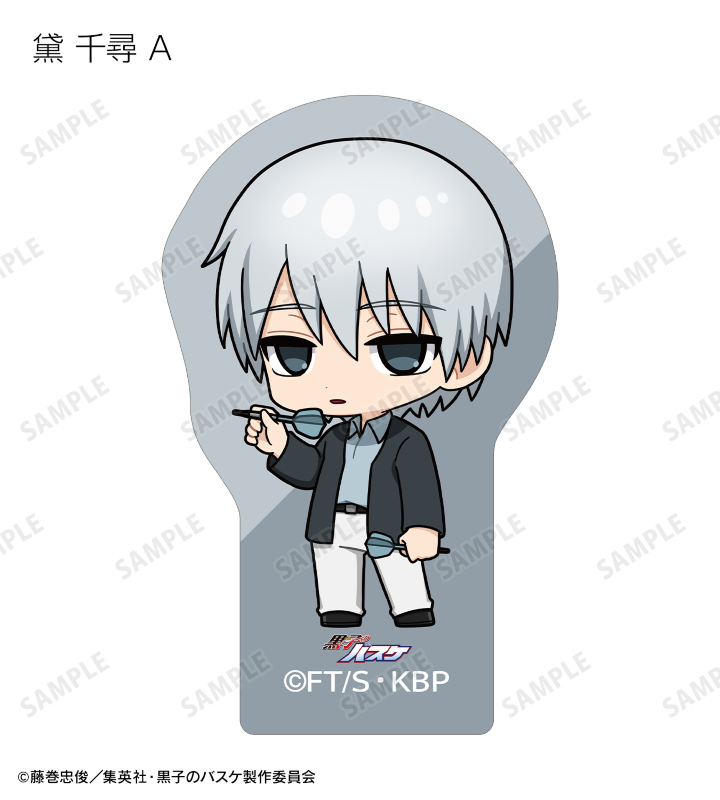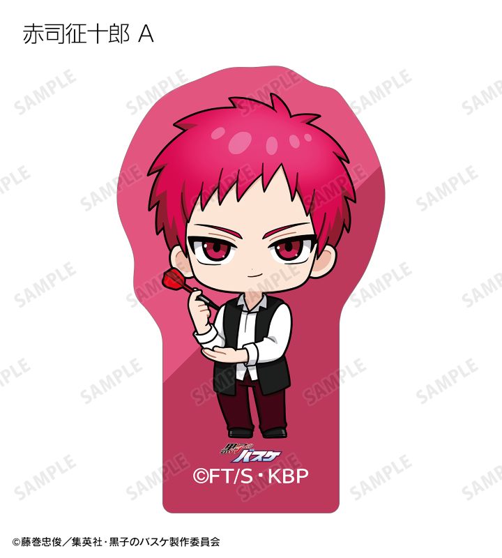黒子テツヤ、火神大我、テツヤ2号、黄瀬涼太、笠松幸男、緑間真太郎、高尾和成、青峰大輝、桃井さつき、紫原 敦、氷室辰也、赤司征十郎、黛 千尋、花宮 真の描き起こしちびキャライラストをメインにデザインし、フレークシールに仕上げました。