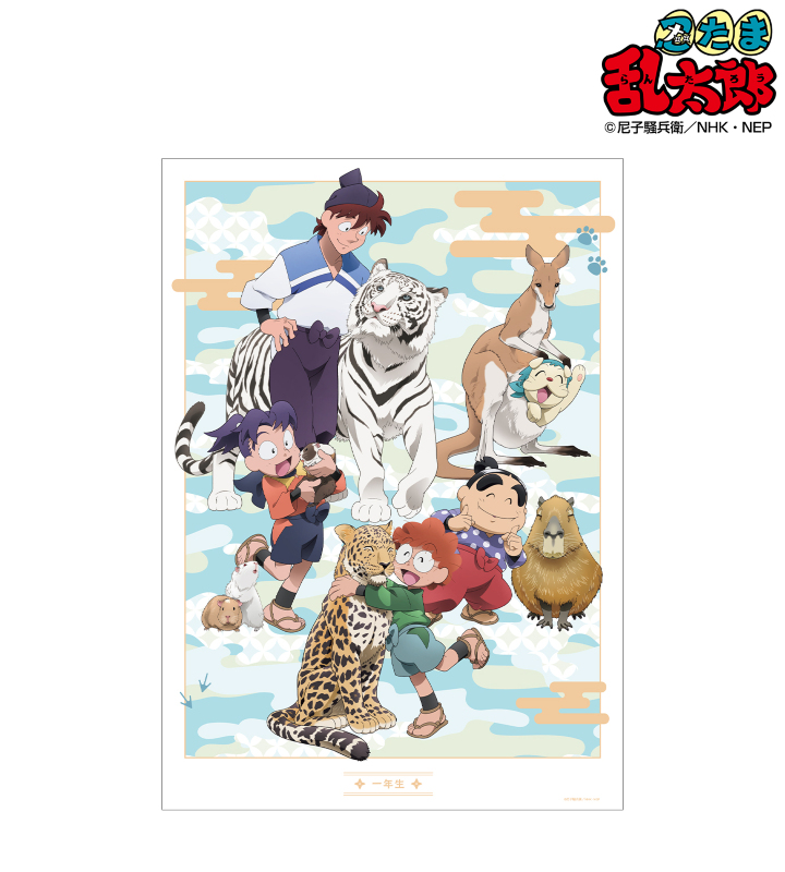 猪名寺乱太郎、摂津のきり丸、福富しんべヱ、土井半助、ヘムヘムの描き下ろしイラストをA3サイズのマット加工されたポスターに仕上げました。