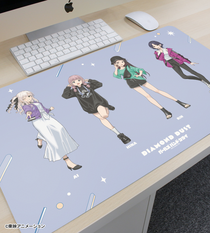 ヒナ、リン、ナナ、アイの描き下ろしイラストとバンド名を、マルチデスクマットに仕上げました。