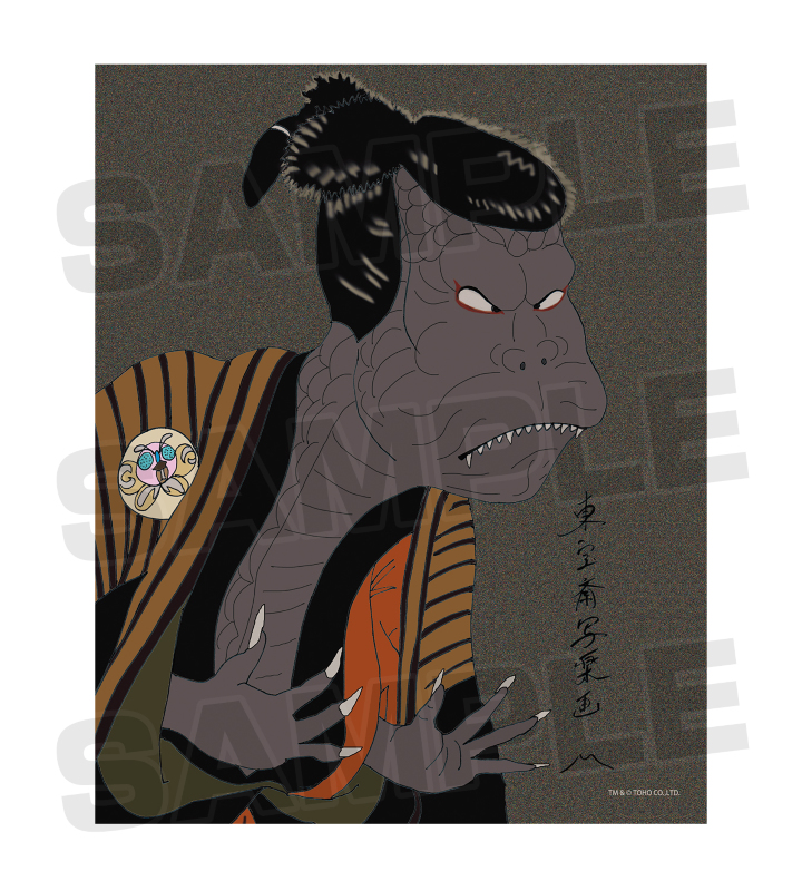 それをイラストにするにあたり、東京オリンピックも近い今、全世界に向けて、和のゴジラを前面に打ち出したいと強く思いました。 又、ゴジラの顔と手の比率やポーズが、これまた日本を代表するアーティスト、写楽の名画に似ていると感じていましたので、即、取り入れました。 肩の部分は茶目っ気で、モスラをデザインしています。