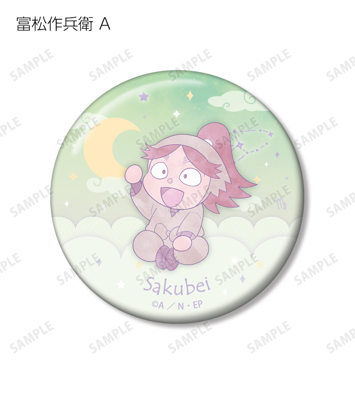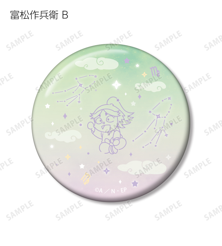 富松作兵衛のちびキャライラストと星座を組み合わせて、缶バッジ2個セットに仕上げました。